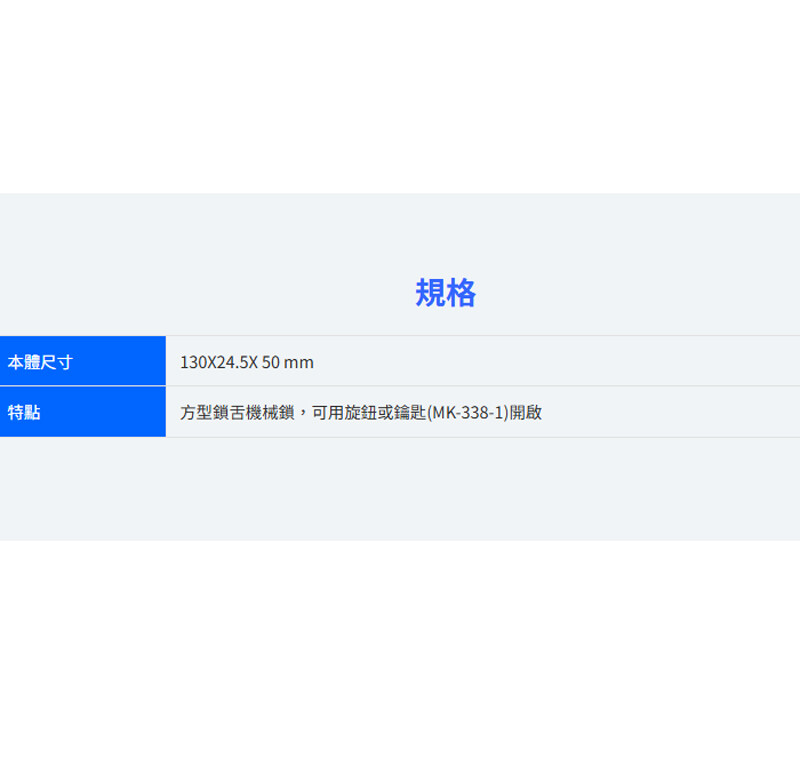 方型鎖舌機械鎖可搭配 PGS -701A / 702A / 701B / 702B 等陰極電鎖 應用於鋁門、鐵門、硫化銅門、木門 適用門厚40~50MM 特點: 方型鎖舌機械鎖,可用旋鈕或鑰匙(MK-338-1)開啟