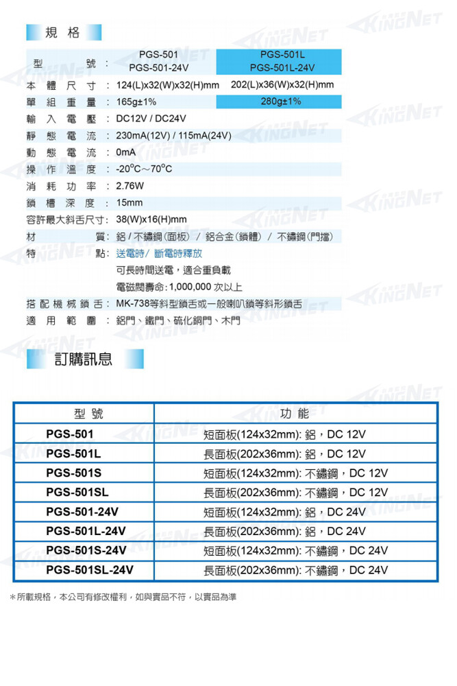 帝網監視器 鵬驥 Pegasus PGS-501S-24V 送電開/斷電開 可調整陰極電鎖 陰極鎖