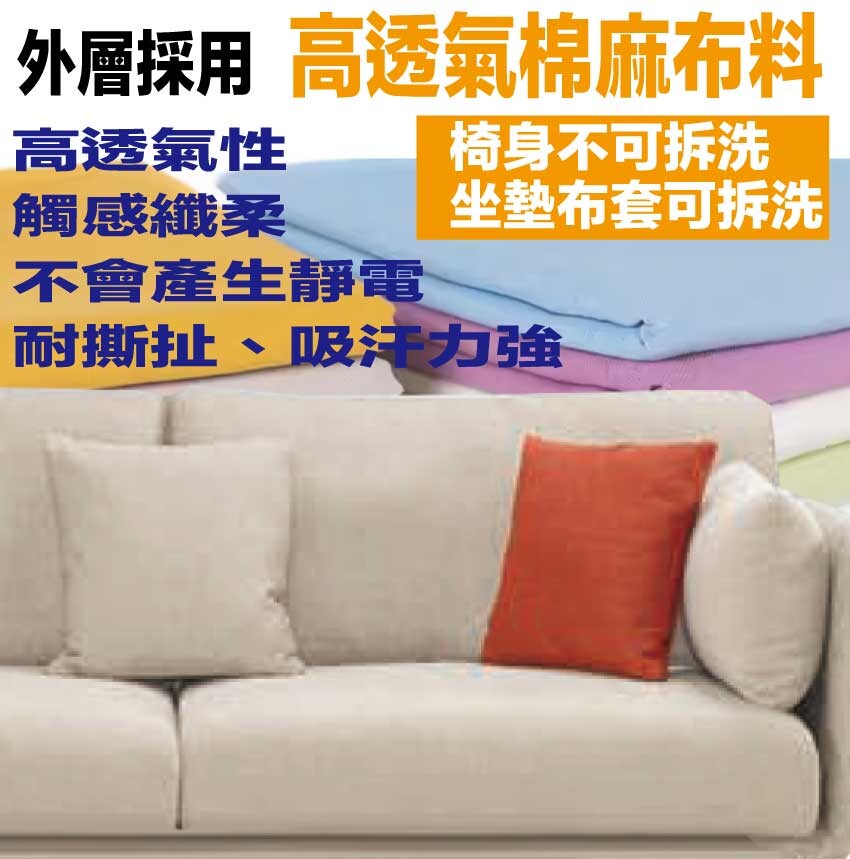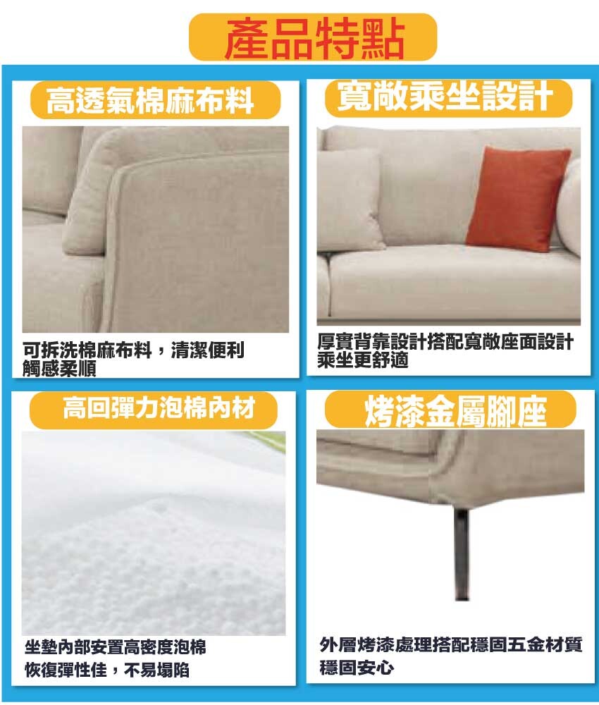 採用內部實木板材框架+烤漆金屬腳座+透氣棉麻布料+高回彈力加厚泡棉等安心材質製造