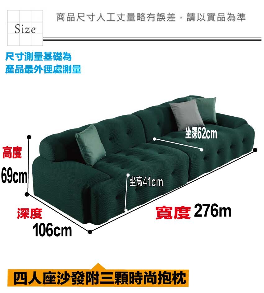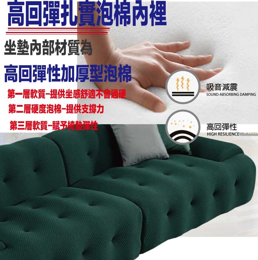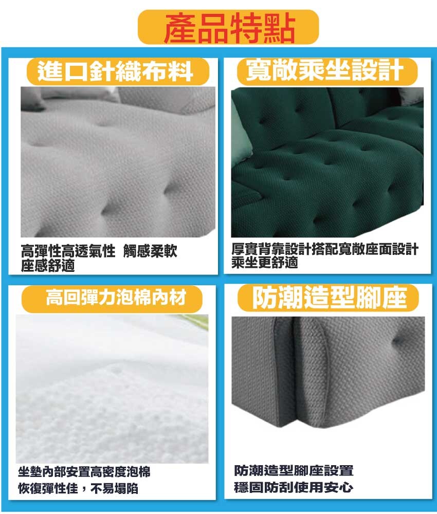 採用內部實木板材框架+防潮造型腳座+進口透氣針織布+高回彈力加厚泡棉等安心材質製造