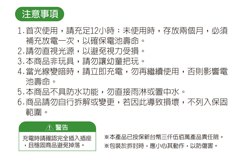 4.當光線變暗時,請立即充電,勿再繼續使用,否則影響電池壽命。
