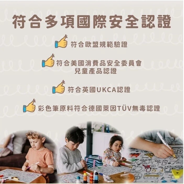 ◆ 符合歐盟規範驗證 符合美國消費品安全委員會兒童產品認證 符合英國UKCA認證 彩色筆墨水原料符合德萊因無毒認證