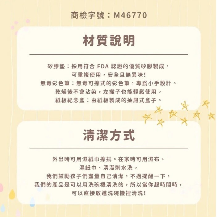 ◆ 材質:FDA認證食品級矽膠、無毒可擦拭色筆