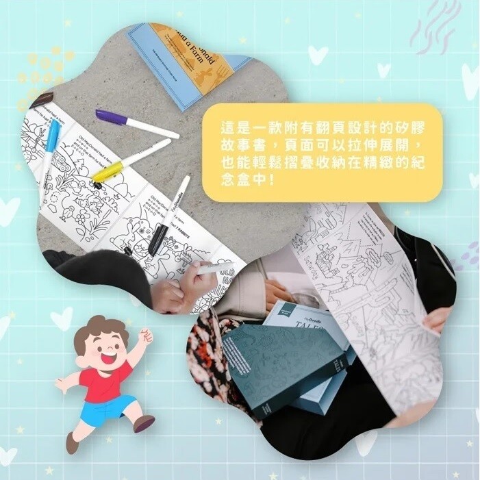 ◆ 這是一款附有翻頁設計的矽膠故事書 頁面可以拉伸展開與摺疊;合起來15x15cm, 展開時60cmx15cm