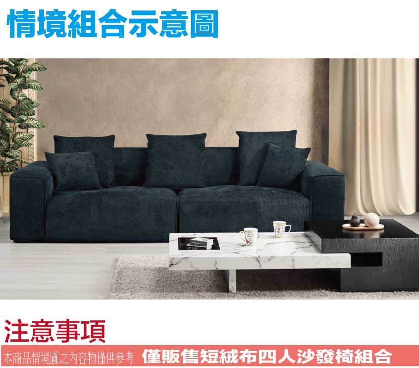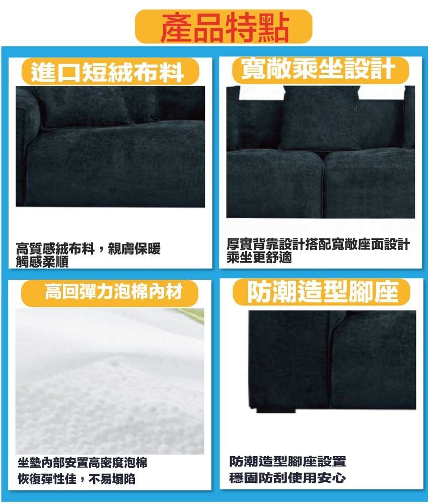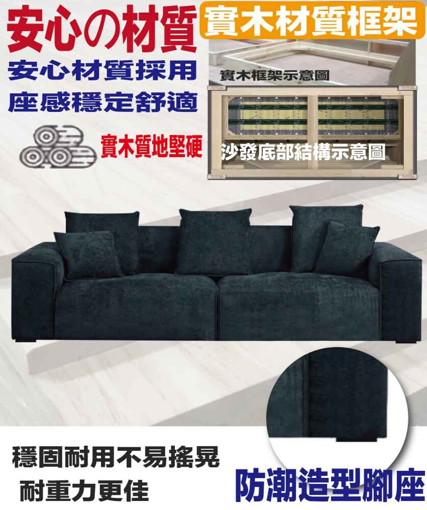 採用內部實木板材框架+防潮造型腳座+進口短絨布料+高回彈力加厚泡棉等安心材質製造