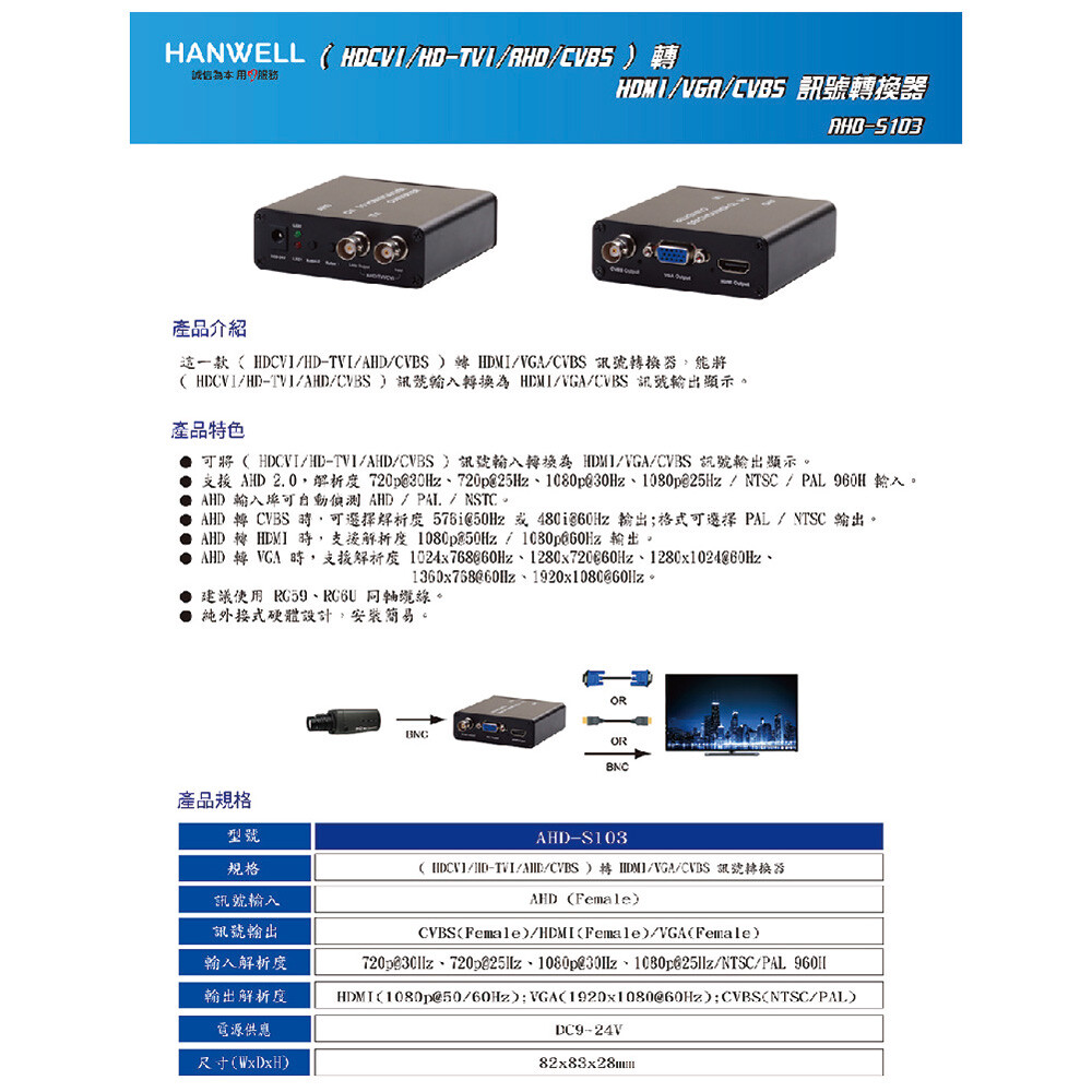 ● AHD 轉 HDMI 時,支援解析度 1080p@50Hz / 1080p@60Hz 輸出。