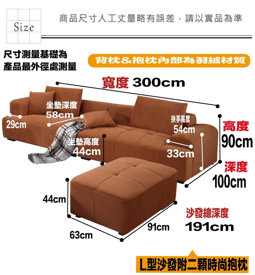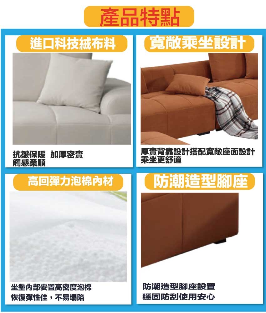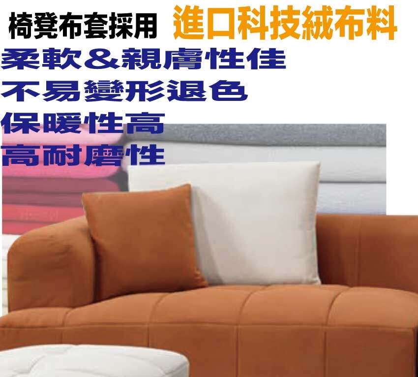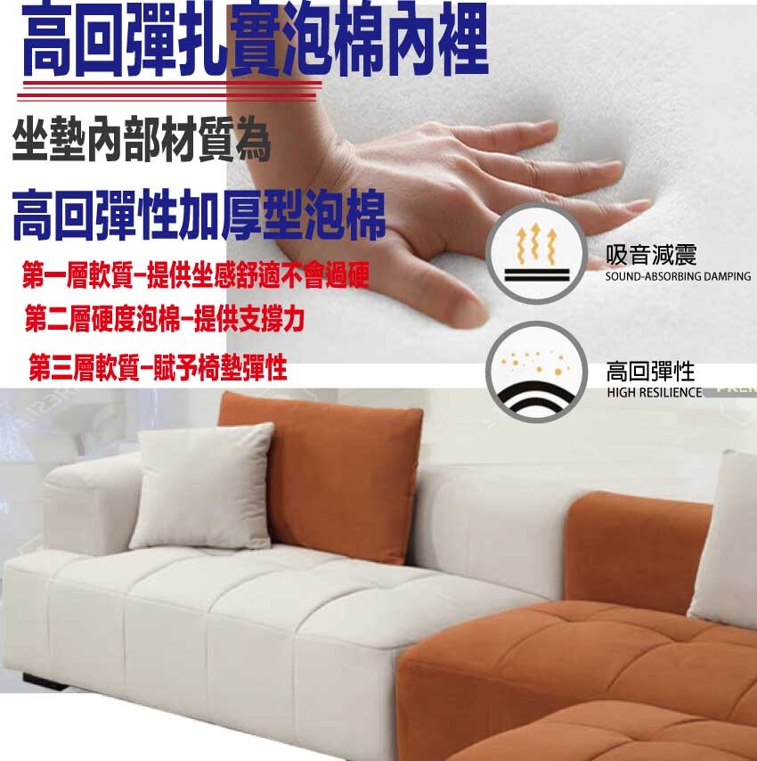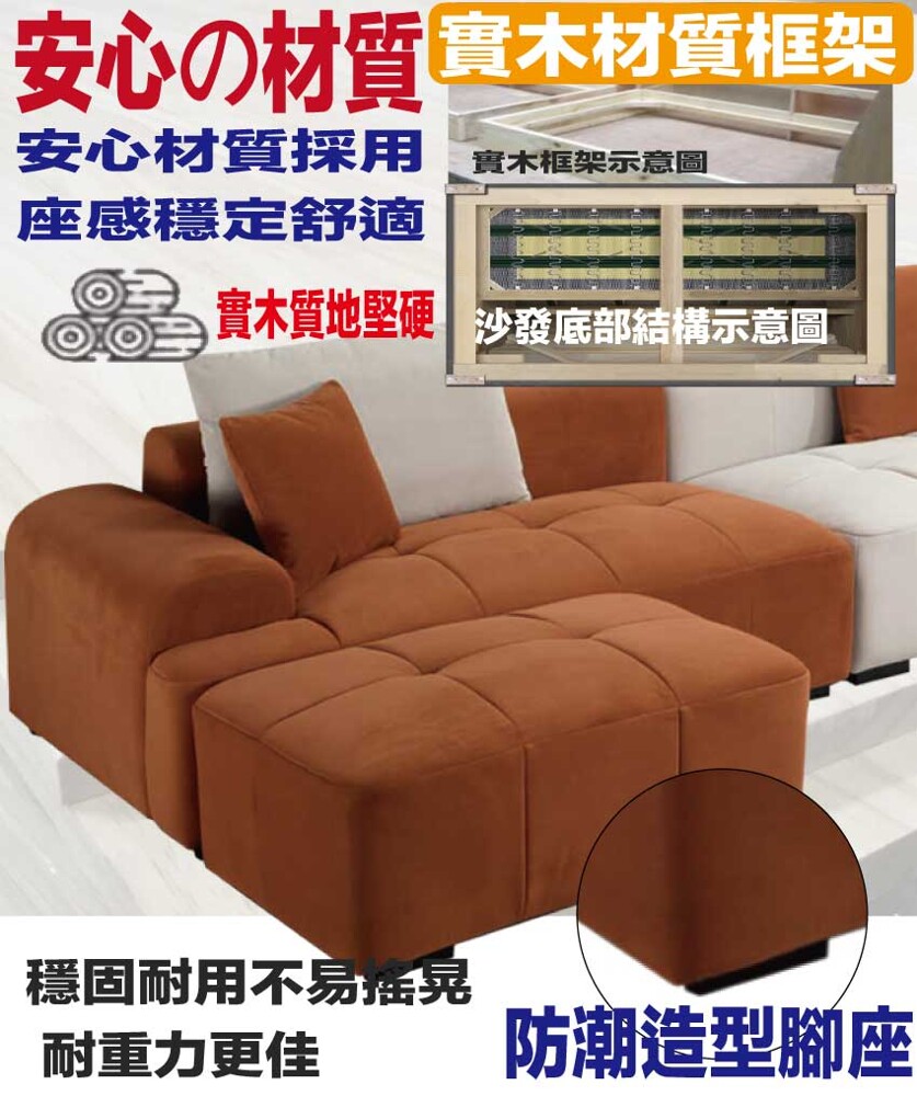 採用內部實木板材框架+防潮造型腳座+進口科技絨布+高回彈力加厚泡棉等安心材質製造