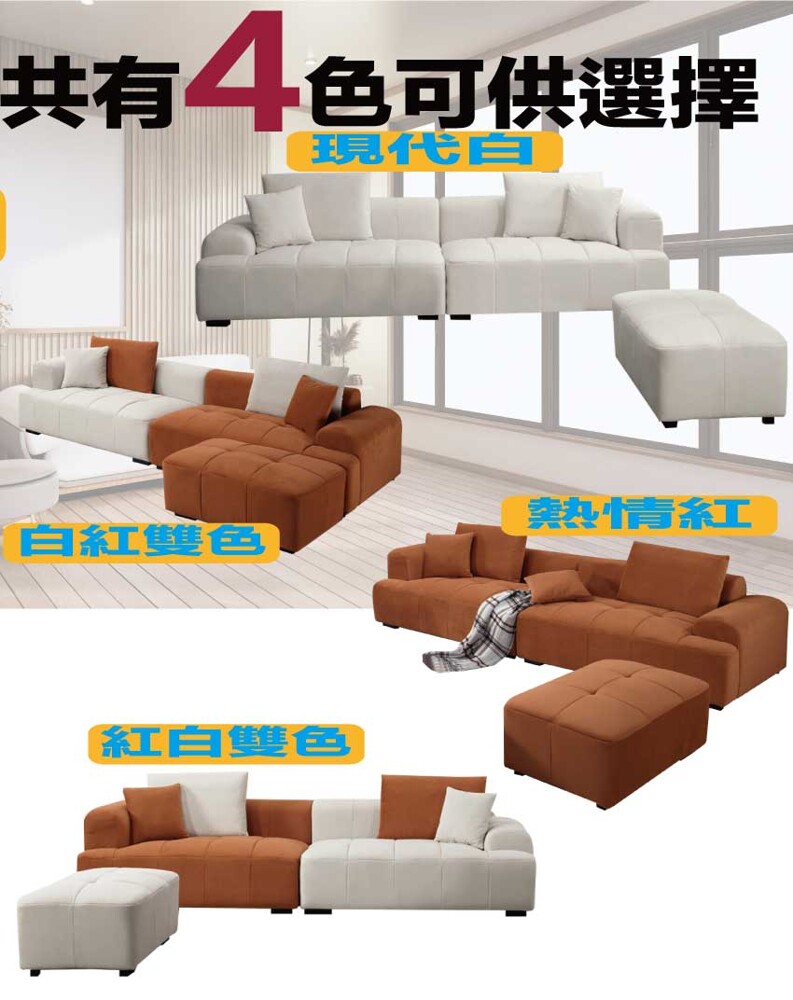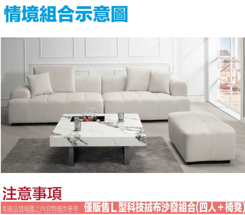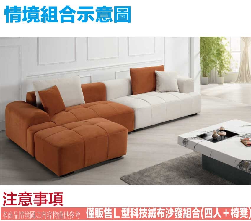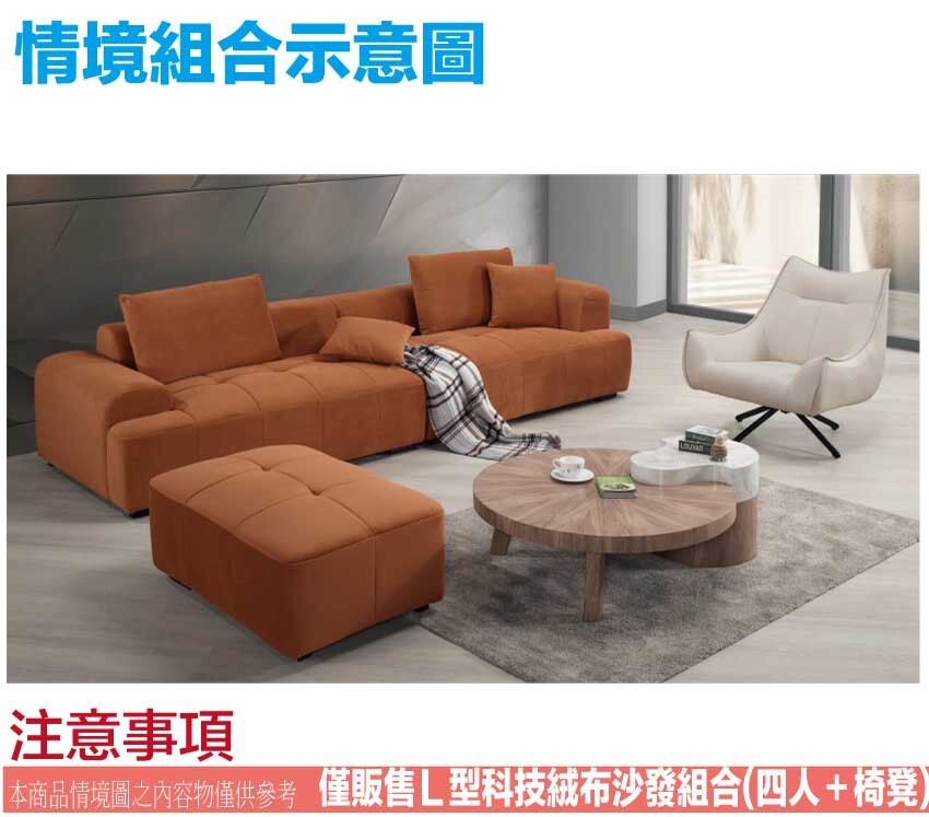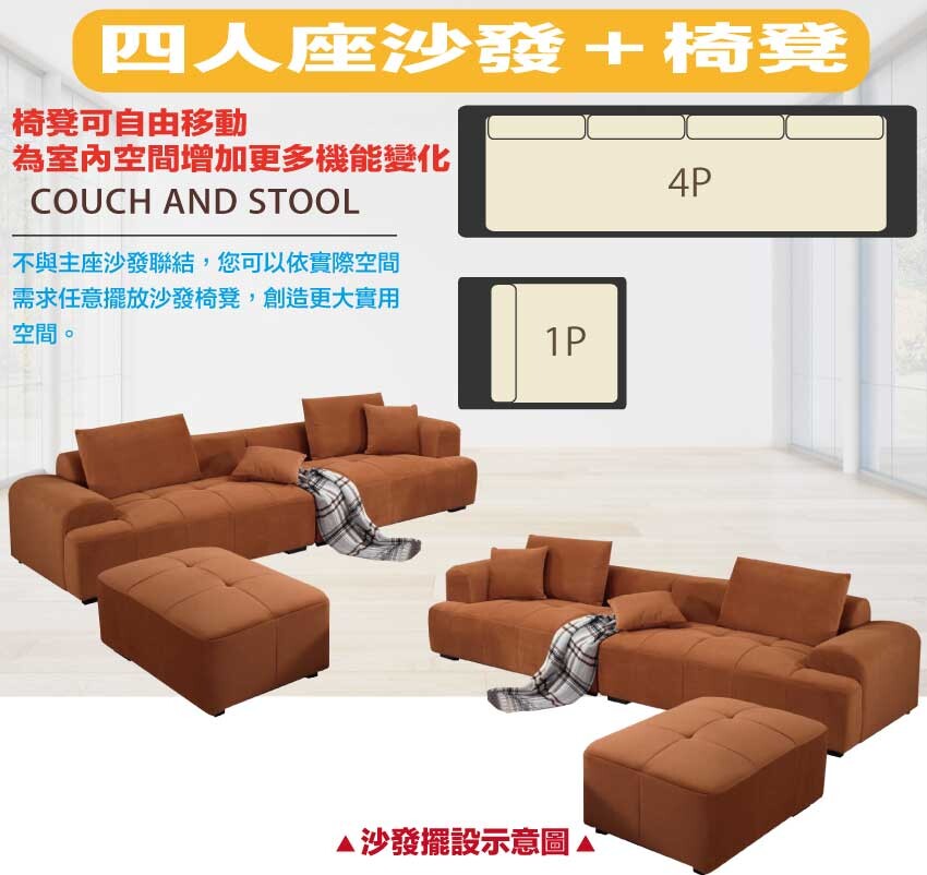 此組L型沙發椅為四人座+椅凳組合,椅凳可視使用需求自由擺放增加居家空間變化便利性