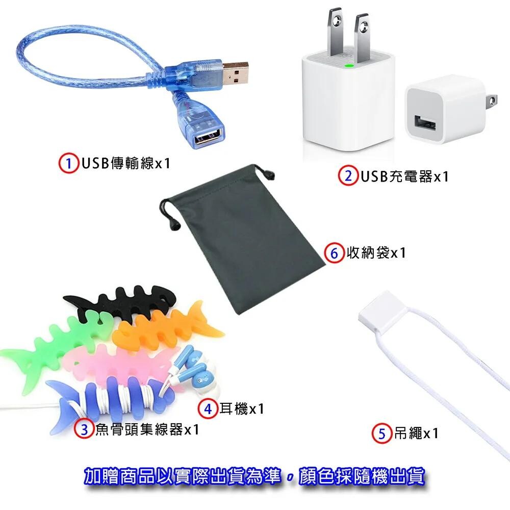 6大好禮: 充電器x1,USB傳輸線x1,耳機 x1,收納袋x1,魚骨頭集線器x1,吊繩x1