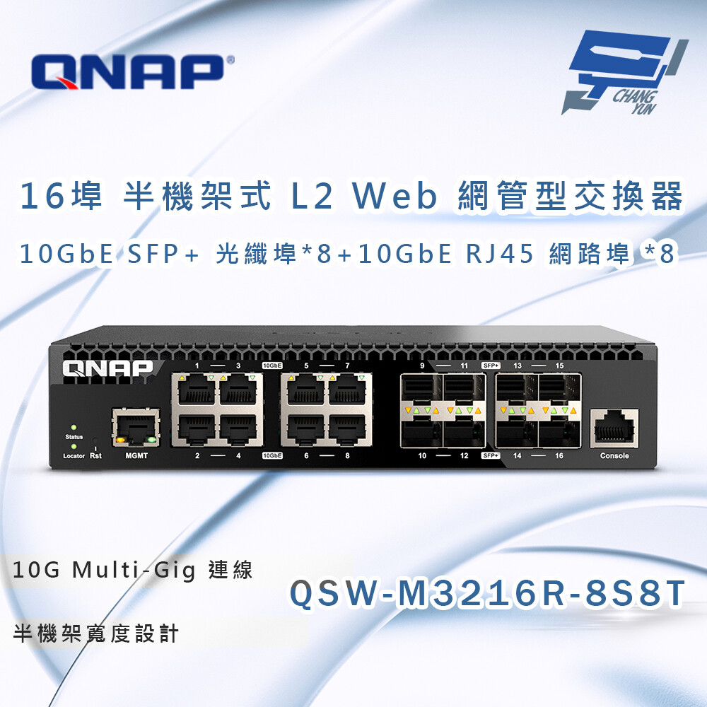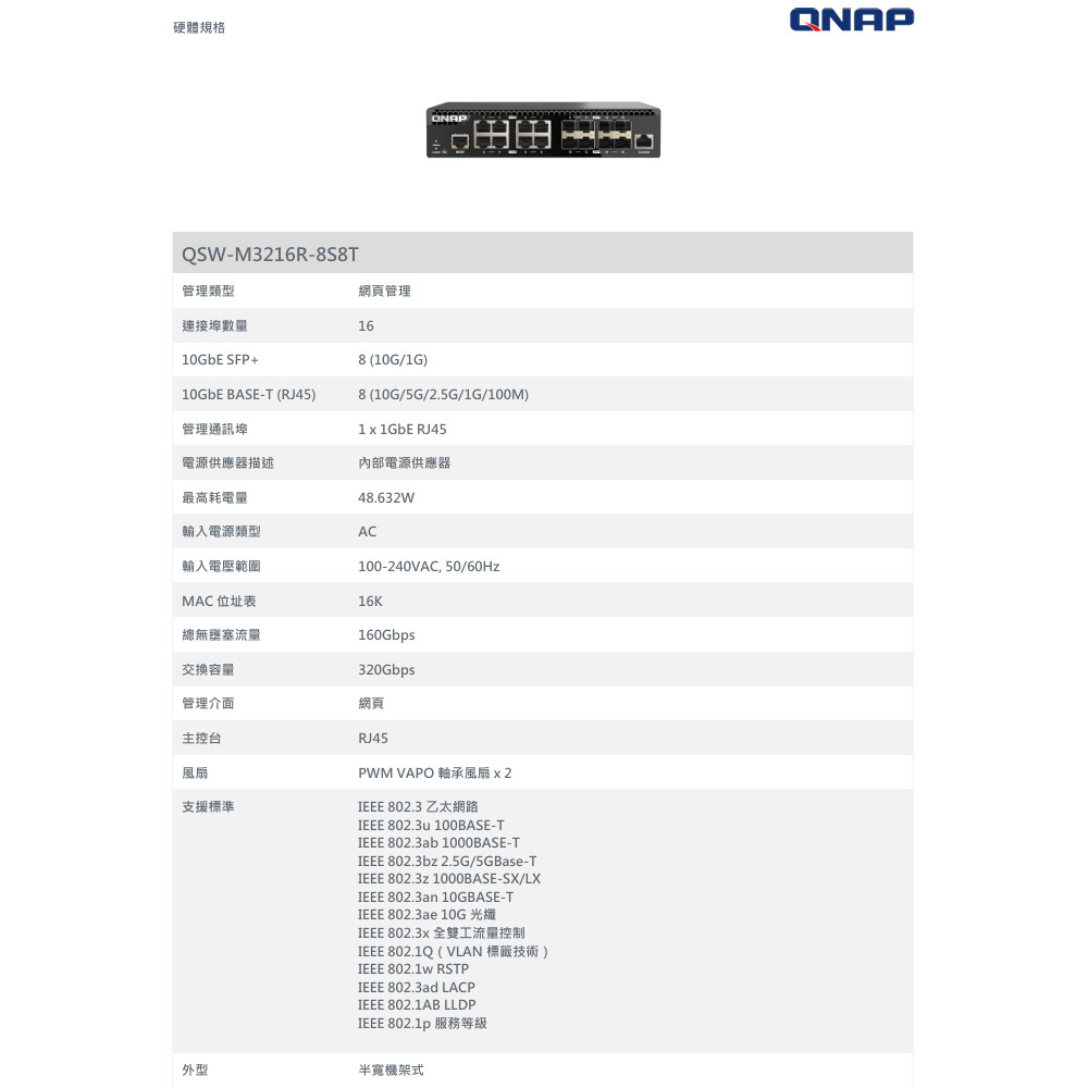 半寬機架式設計 : 輕巧型交換器,可在 1U 機櫃放置兩台 QSW-M3216R-8S8T,或搭配其他 QNAP 半機架式交換器,空間利用效率高。