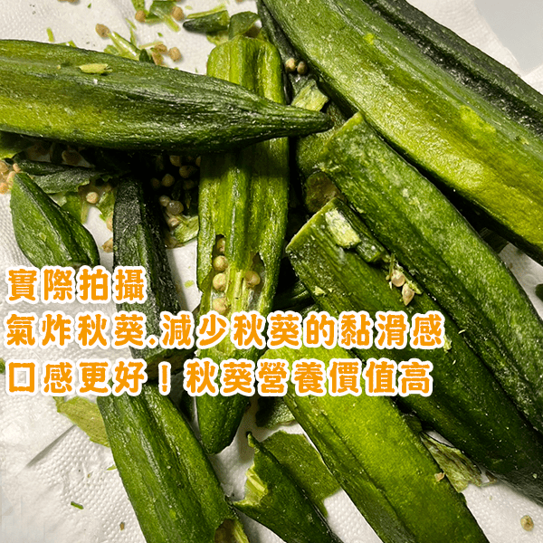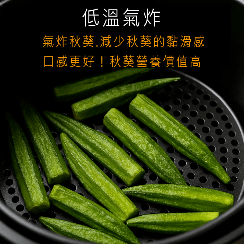 在熱氣輕盈的氣炸鍋裡,新鮮翠綠的秋葵搖身一變