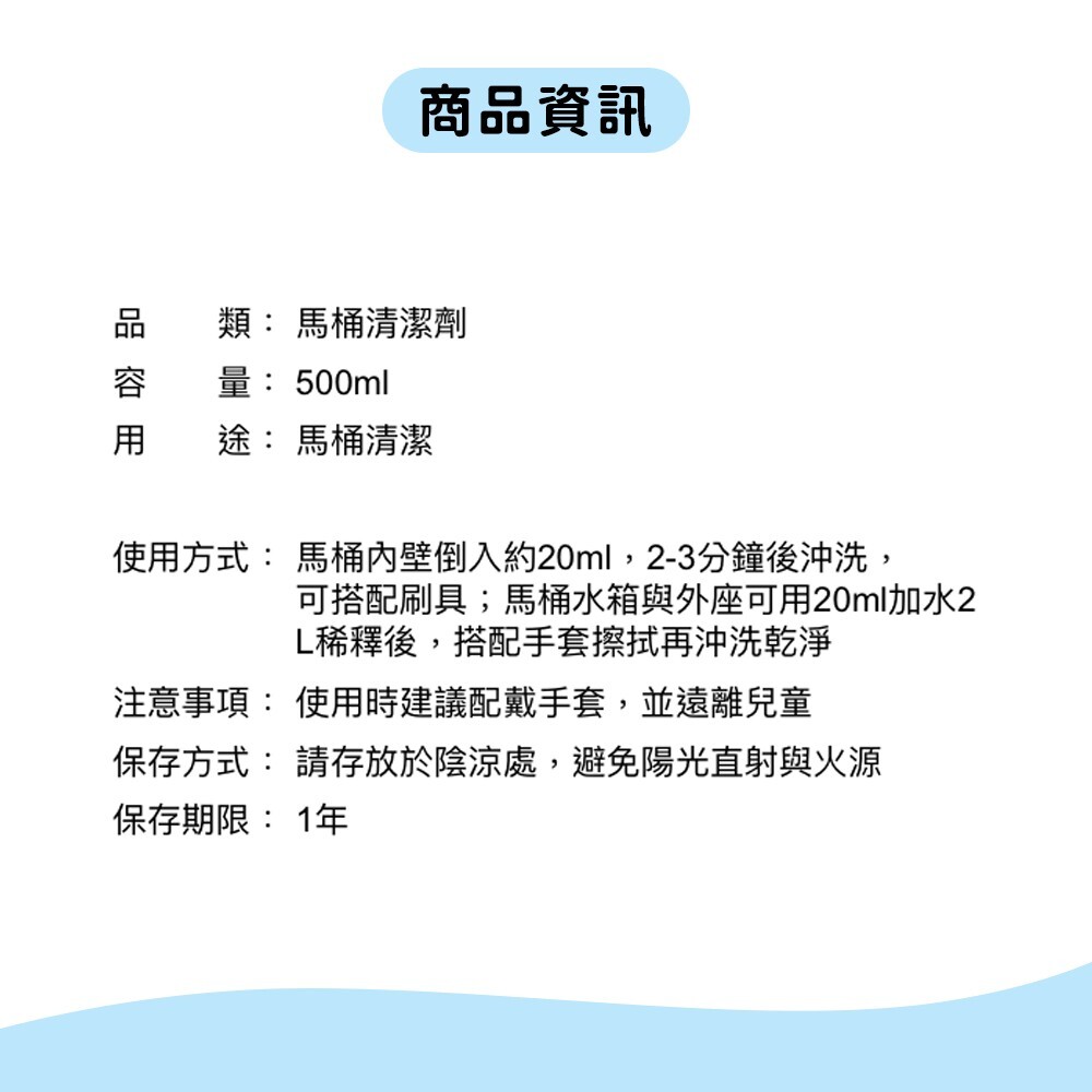 每瓶容量 500ml,剛剛好的大小不占空間,方便收納與日常使用。建議每週使用 2-3 次,維持馬桶清潔與防臭效果,長期使用還能有效預防頑垢堆積。