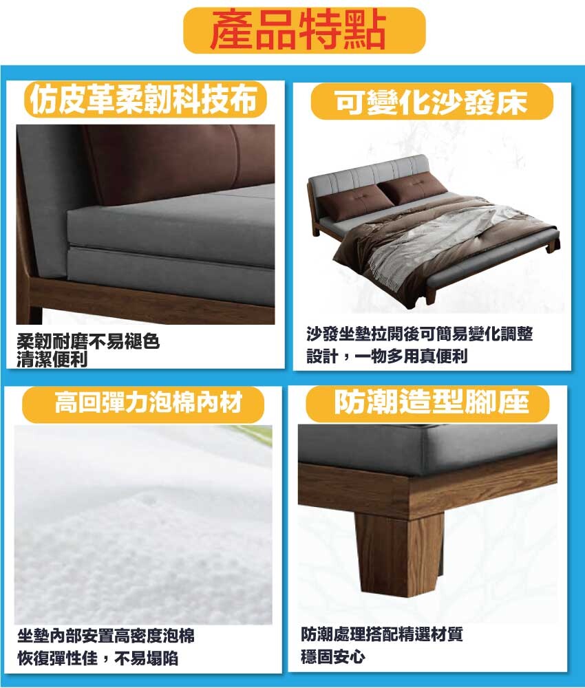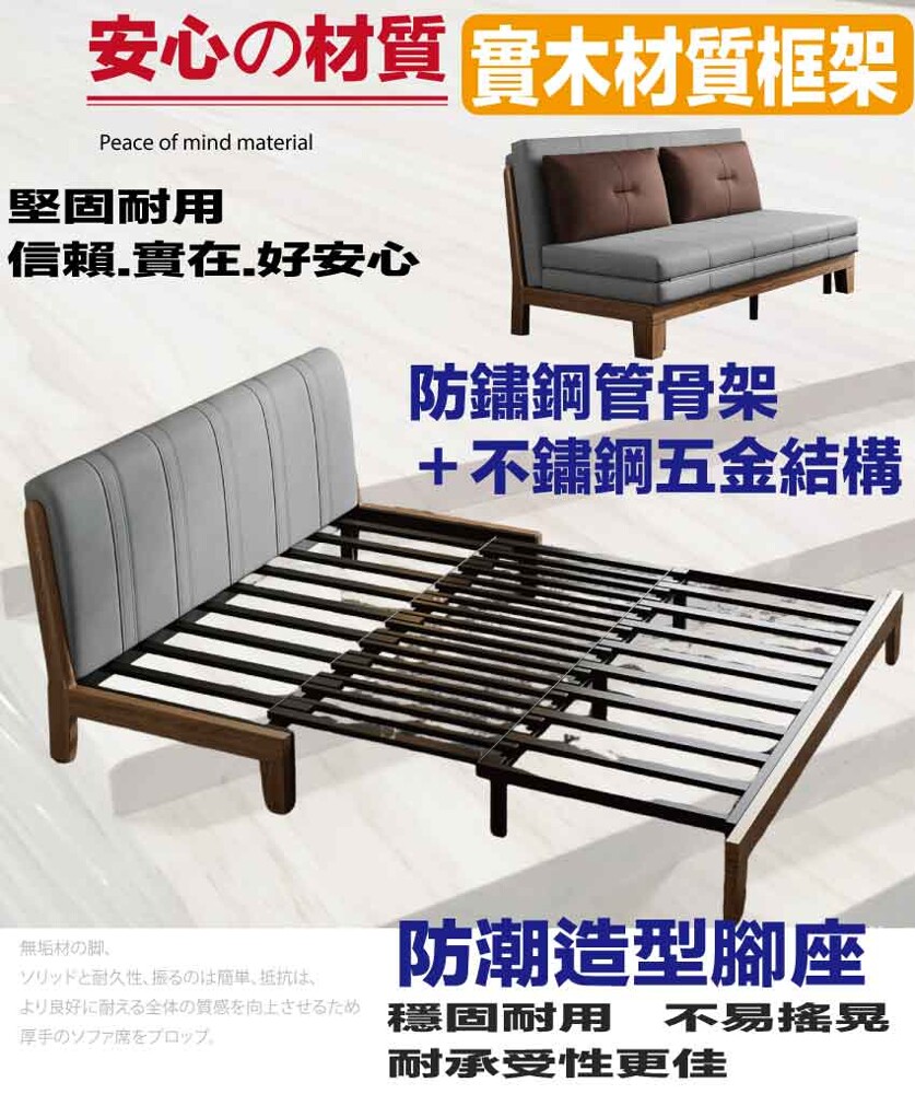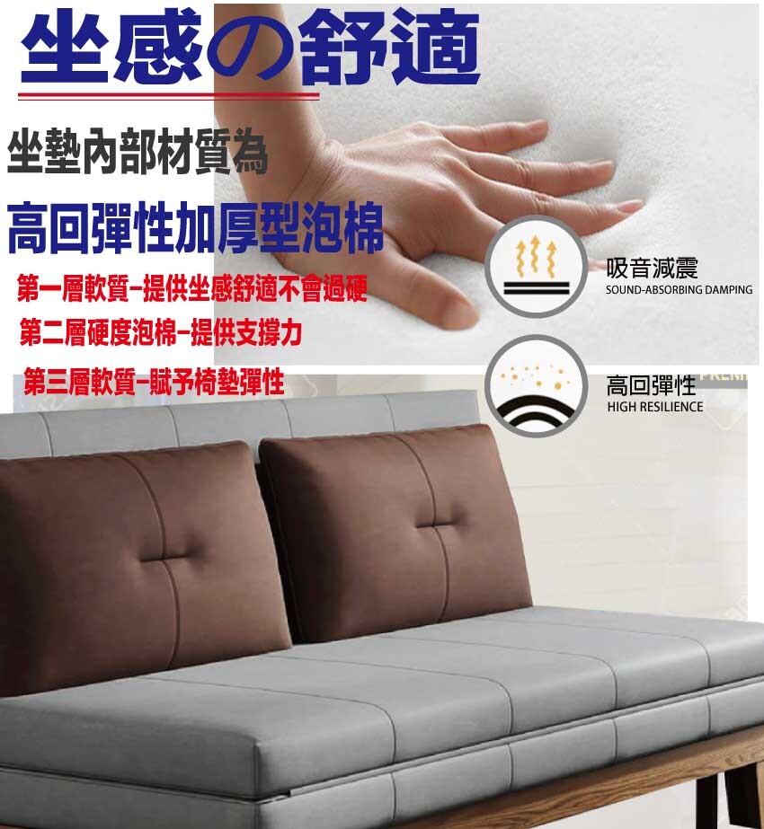 採用防鏽鋼管結構&不鏽鋼五金結構+高回彈力加厚泡棉+仿皮革柔韌科技布等安心材質