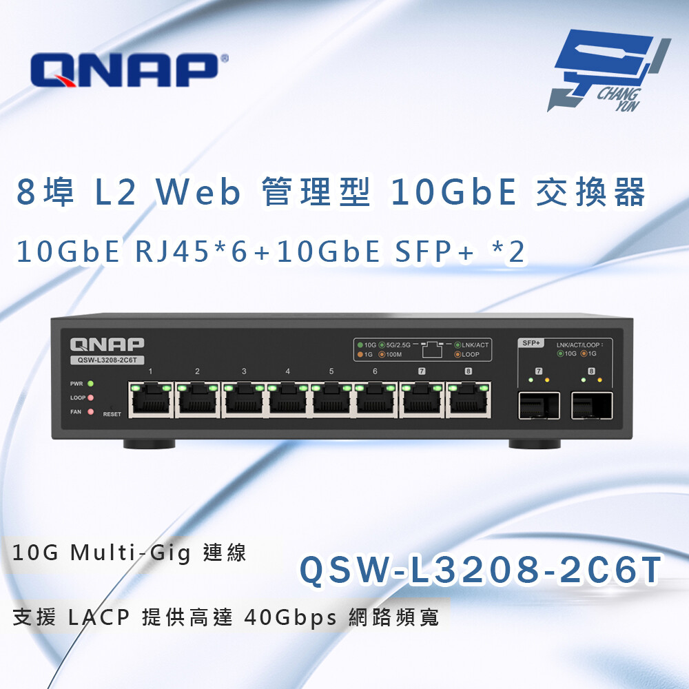 10G Multi-Gig 連線 : 6 個 10GbE RJ45 網路埠 (10G/5G/2.5G/1G/100M) 及 2 個 10GbE SFP+ (10G/1G) / RJ45 (10G/5G/2.5G/1G/100M) 複合埠,可串接多元介面的網路設備。