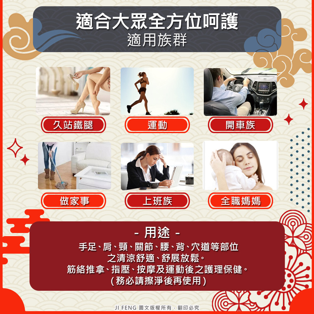 使用方法:抹取適量的精油霜,每日1~3次,反覆按摩