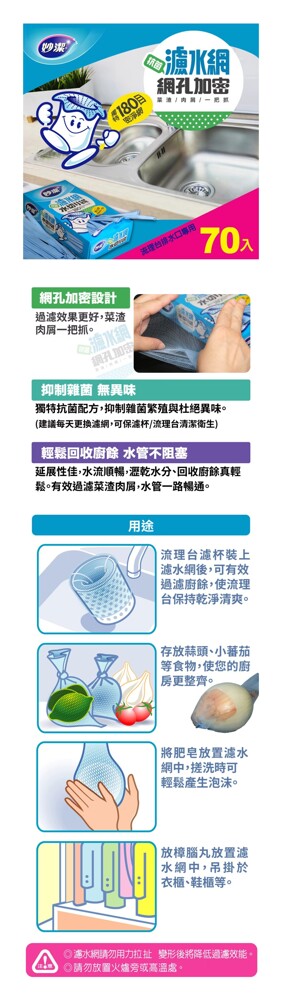 .網孔加密設計-過濾效果更好,菜渣肉屑一把抓。 .抑制雜菌無異味-獨特抗菌配方,抑制雜菌繁殖與杜絕異味。 .輕鬆回收廚餘 水管不阻塞-延展性佳,水流順暢,瀝乾水分、回收廚餘真輕鬆。有效過濾菜渣肉屑,水管一路暢通。