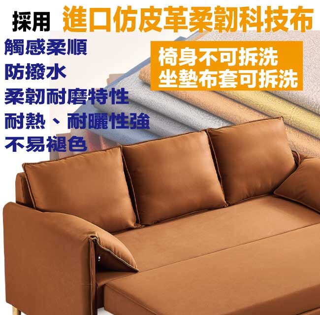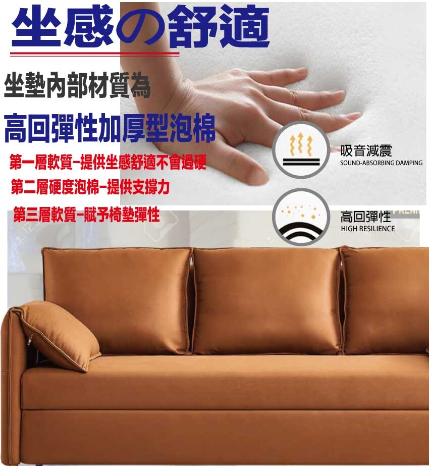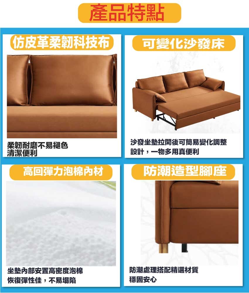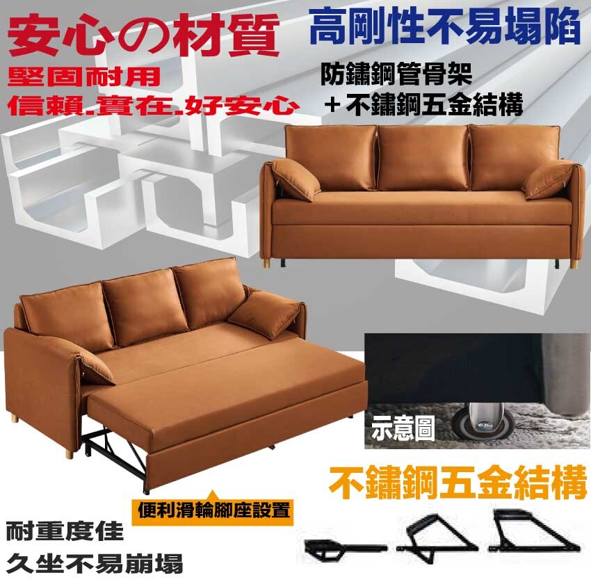 採用防鏽鋼管結構&不鏽鋼五金結構+便利滑輪設置+高回彈力加厚泡棉+仿皮革柔韌科技布等安心材質
