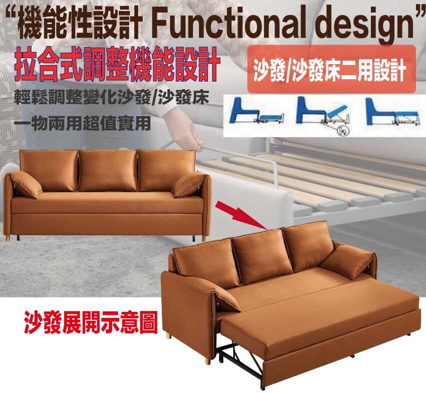 沙發將坐墊往前拉開後即可即可變化為沙發床使用,搭配滑輪底座讓您更變化使用.實用機能性設計打造居家便利性