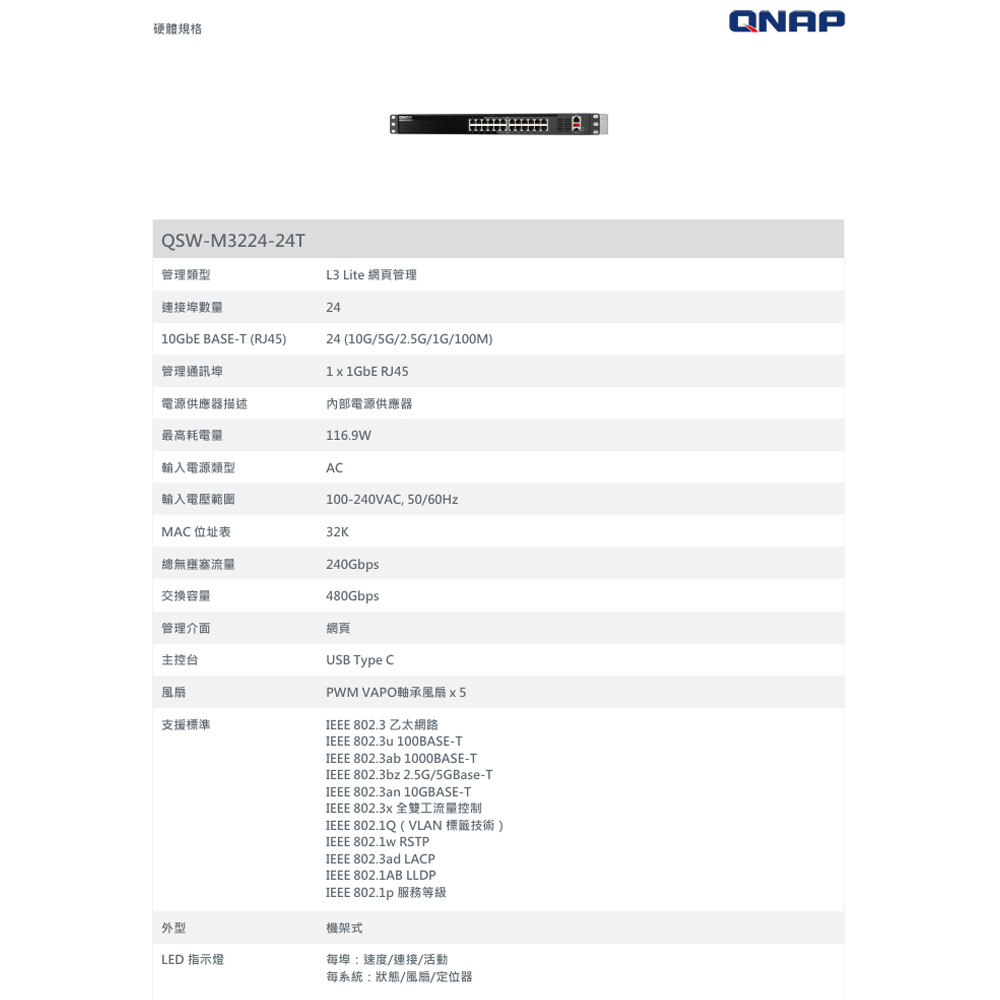 24 埠 10GbE 高速網路:背板頻寬高達 480Gbps;相容 10GBASE-T 及 Multi-Gigabit NBASE-T™ 標準,可串接各式相容 10G/5G/2.5G/1G的網路設備,且支援鏈路聚合提供高達單埠 20Gbps 的網路頻寬。