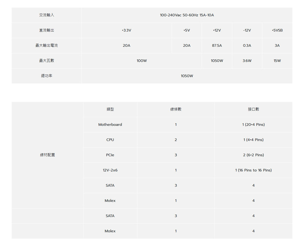 MONTECH(君主) CENTURY II 1050W 80+金牌 全模組 電源供應器 十年保固