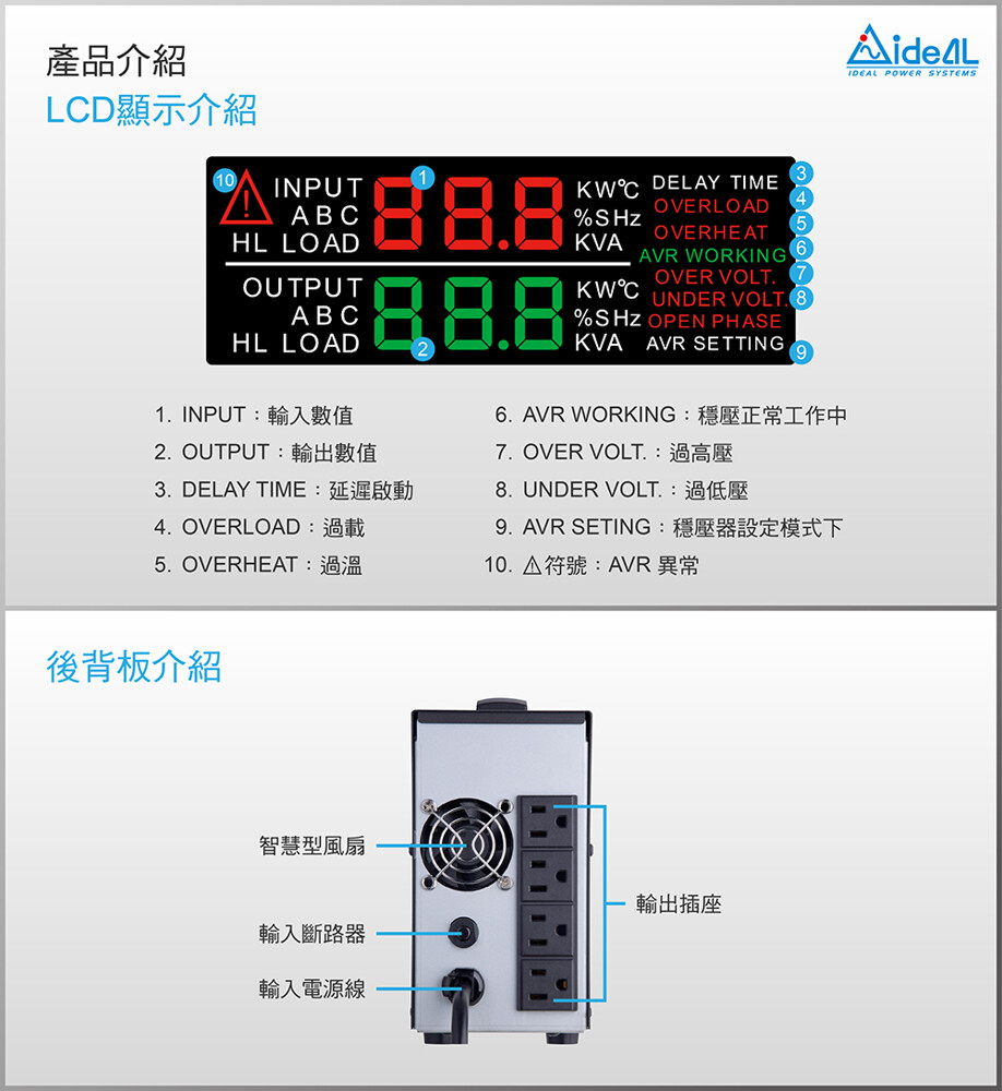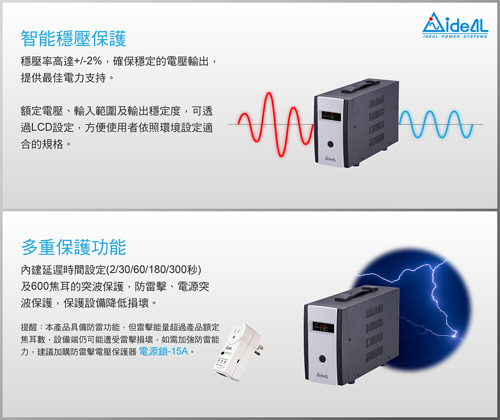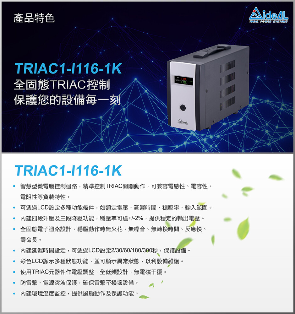 ◇ 全固態TRIAC穩壓器(不具UPS功能) ◇ 額定容量: 1000VA/800W ◆ 延遲啟動功能 ◆ 彩色LCD面板顯示 ◆ 台灣生產製造,工廠直營 ◆ 內建四段升壓及三段降壓 ◆ 具有穩壓、過載、雷擊突波保護功能