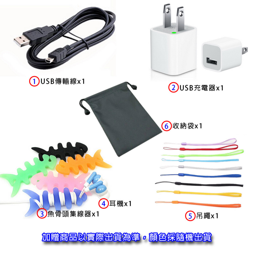 6大好禮:充電器x1, USB傳輸線x1, 耳機 x1, 收納袋x1, 魚骨頭集線器x1,吊繩x1