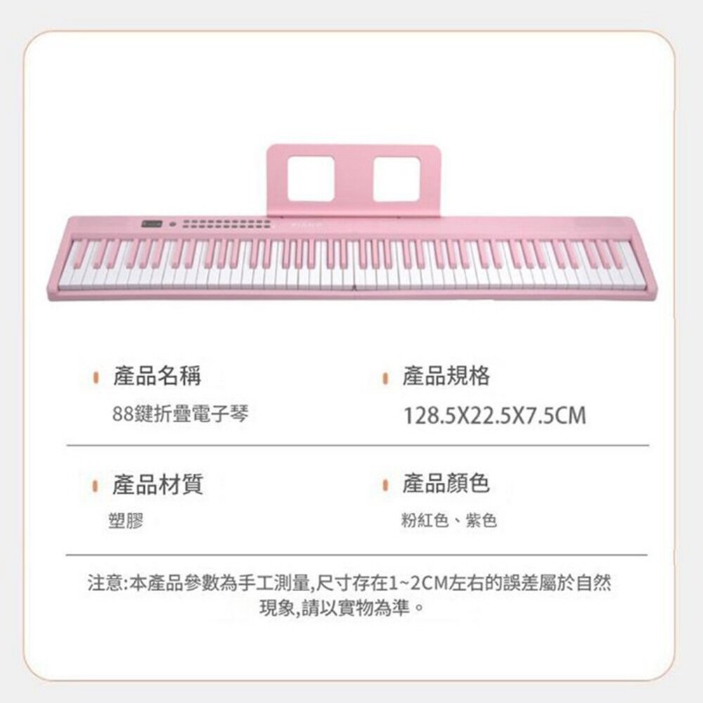 充電版粉紅 標準版 充電版紫色 標準版 產品名稱:88鍵折疊電子琴 產品規格:128.5X22.5X7.5CM 產品顏色:粉紅色、紫色 注意:本產品參數為手工測量,尺寸存在1~2CM左右的誤差屬於自然現象,請以實物為準。