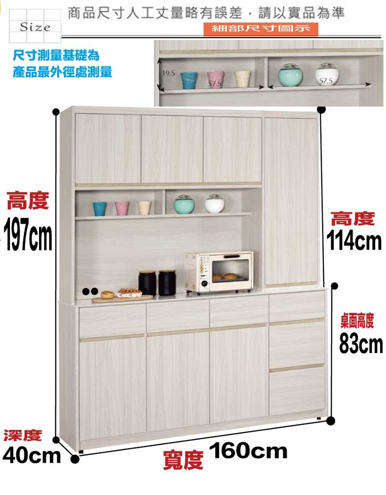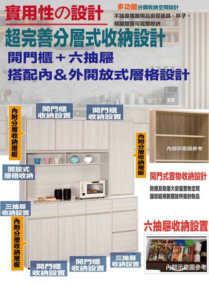 搭配採用開門櫃+六抽屜+內&外開放層格等收納空間設計