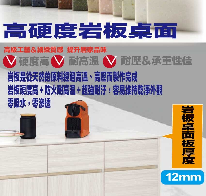 採用防蛀木心板+防潮耐磨底座+防夾手緩衝門片五金+12mm高硬度岩板桌面板+五金滑軌結構等安心材質製造