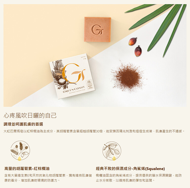 紅棕櫚油擁有能維持肌膚健康的養分,能舒緩肌膚不適,增加肌膚對環境的防護力。