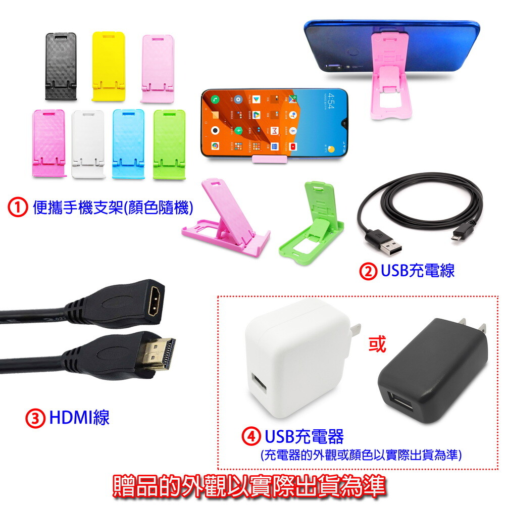 4大好禮: USB充電器x1 + USB供電線x1 + HDMI延長線x1 + 手機支架x1