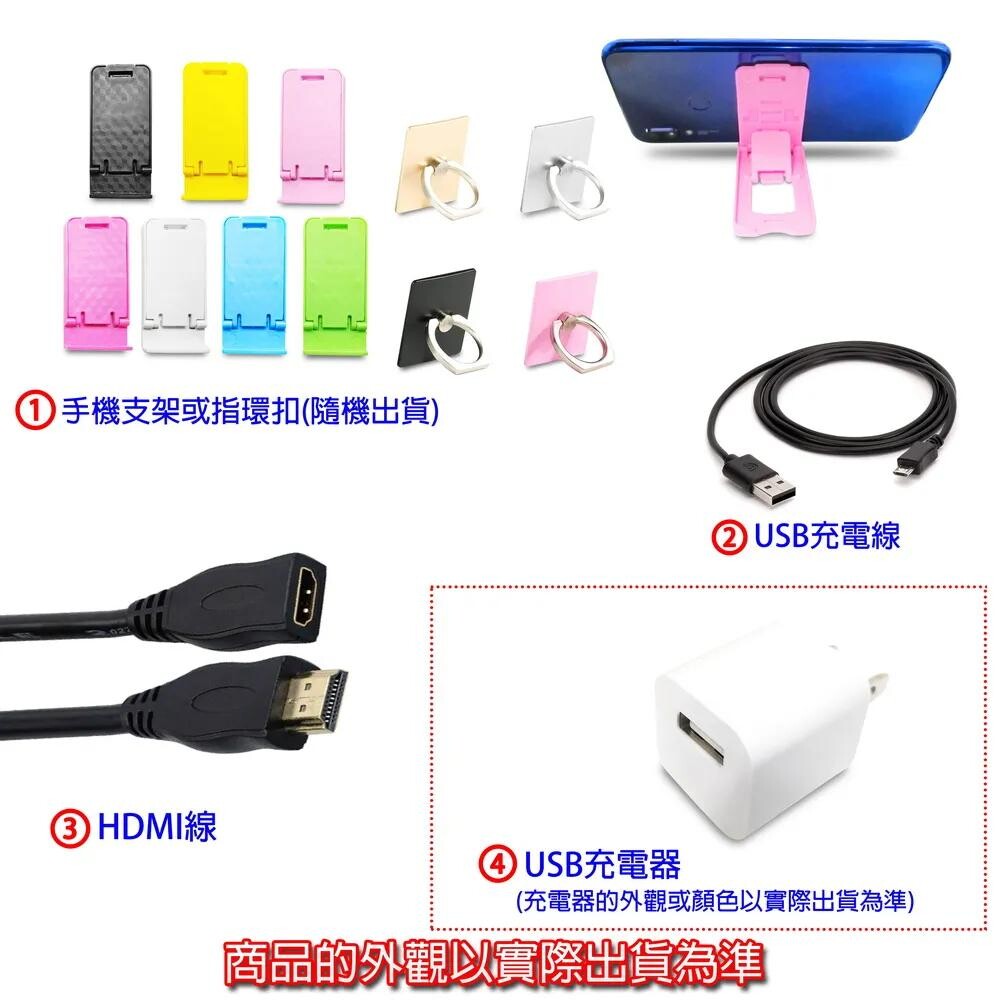 4大好禮: USB充電器x1 + USB供電線x1 + HDMI延長線x1 + (手機支架x1 或 指環扣x1 兩款隨機出貨其中一款)