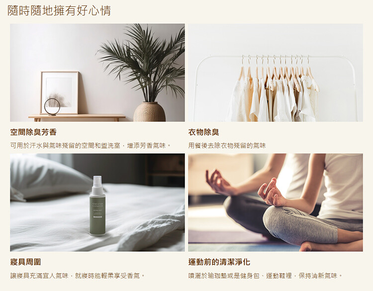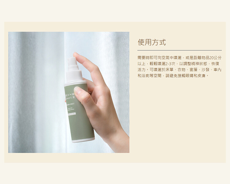 需要時即可向空氣中噴灑,或是距離物品20公分以上,輕輕噴灑2-3次,以調整精神狀態,恢復活力。可噴灑於床單、衣物、窗簾、沙發、車內和浴廁等空間,請避免接觸眼睛和皮膚。