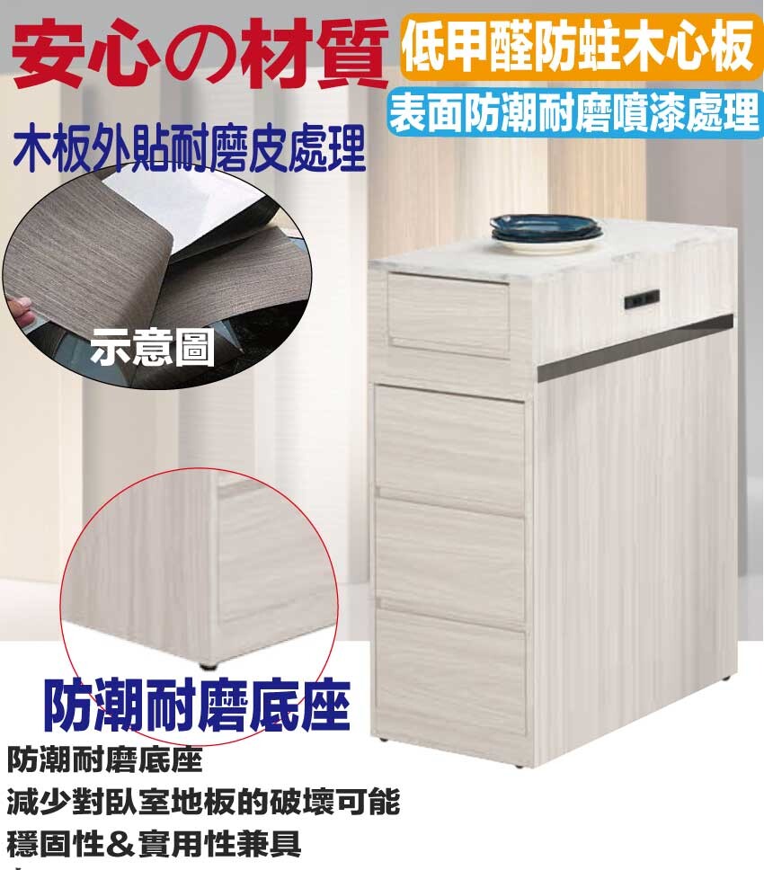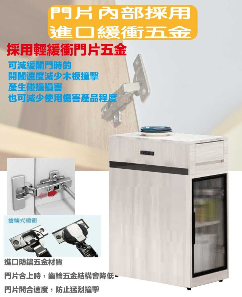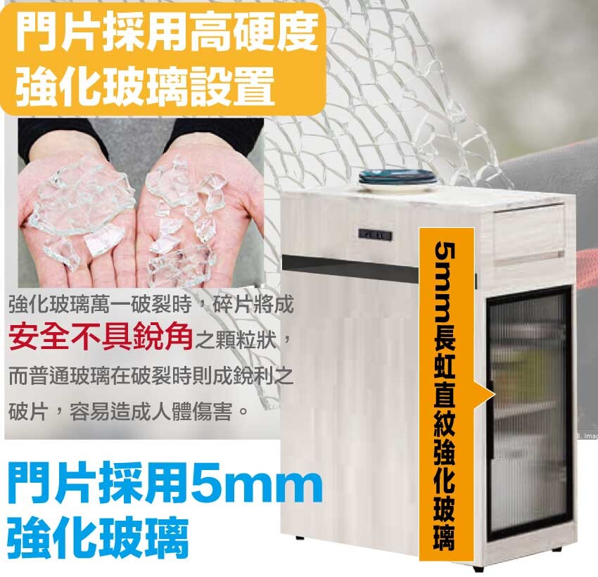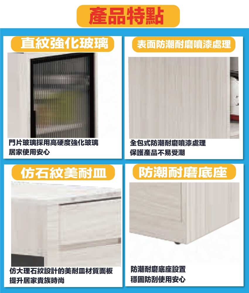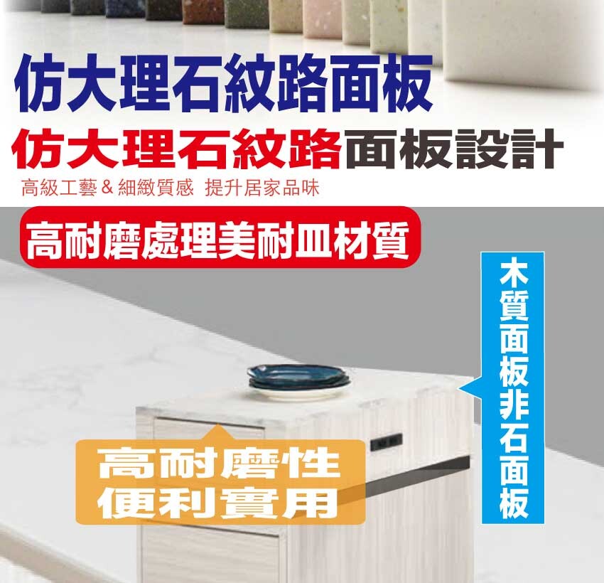 採用防蛀木心板+防潮耐磨底座+防夾手緩衝門片五金+仿石紋耐磨美耐皿桌面板+5mm強化直紋玻璃+五金滑軌結構等安心材質製造