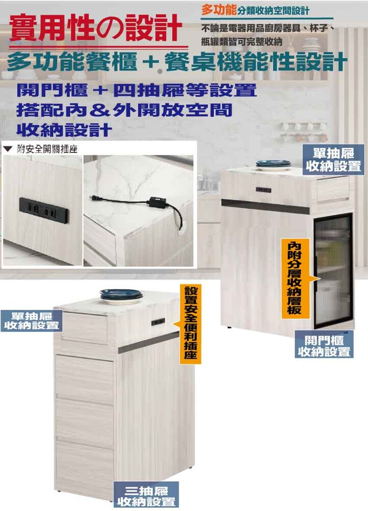 搭配採用開門櫃+四抽屜+開放層格+便利插座等收納空間設計