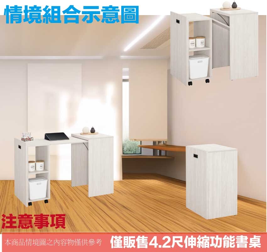 【綠家居】丹尼4.2尺伸縮機能性書桌(書桌可伸縮變化收納櫃) 木紋雙色系+安心材質製造,使用放心+搭配居家更便利,採用防蛀木心板+防潮耐磨底座等安心材質製造 ,外層採用防潮耐磨噴漆處理搭配採用伸縮變化機能+開放層格等收納空間設計,全由專人配送到家,專業安心服務,替你省下更多時間!