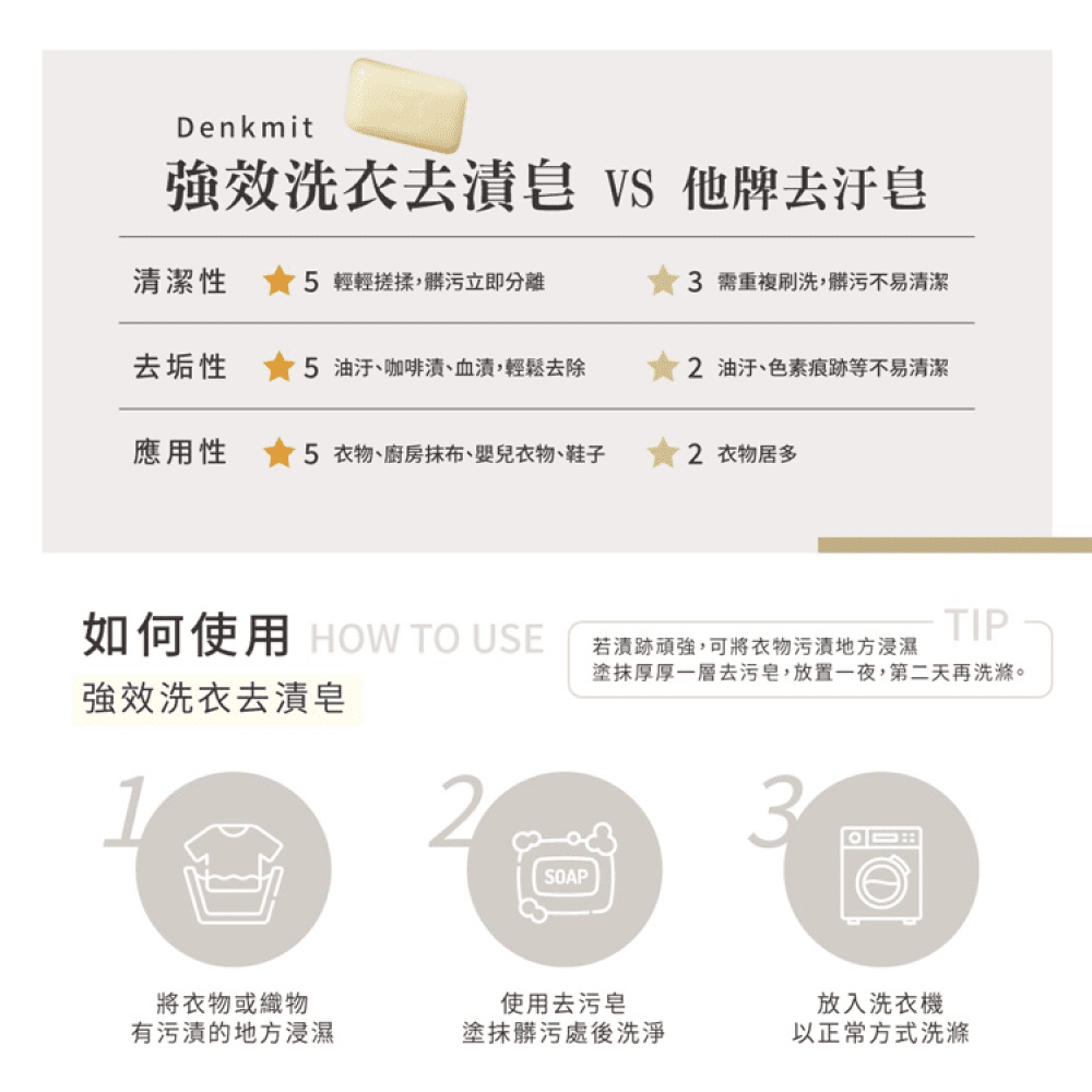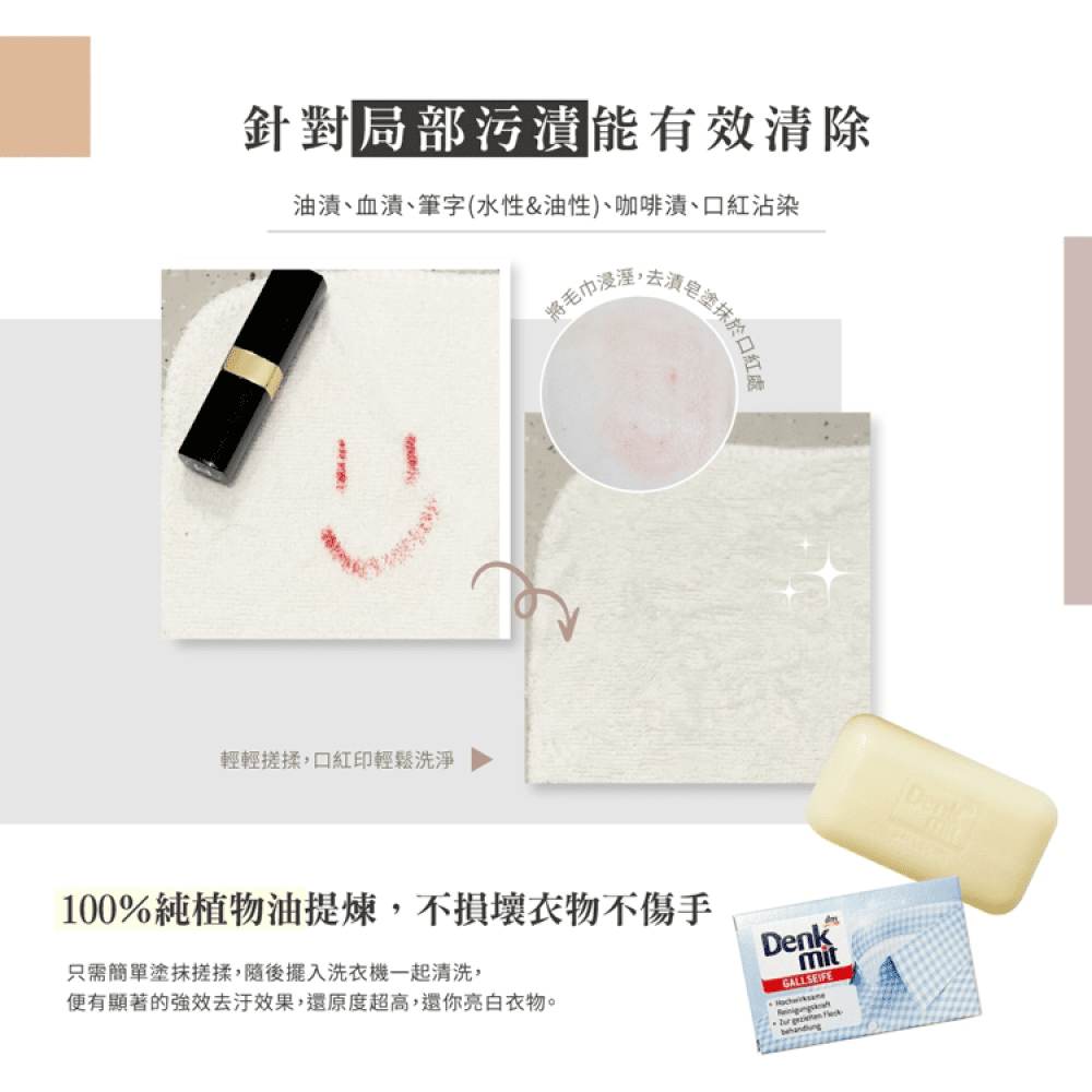 使用方式:先將衣物有污漬的地方浸濕,用去漬皂在污漬處塗抹洗淨。