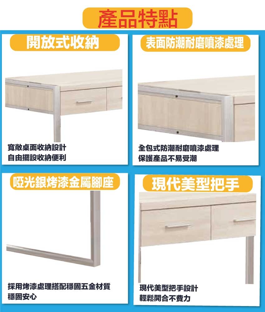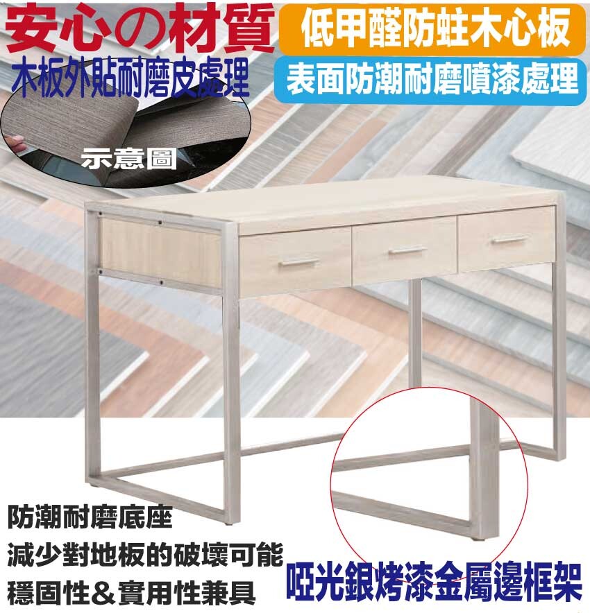 【綠家居】華爾4尺三抽金屬邊框書桌 啞光銀雙色+安心材質製造,使用放心+搭配居家更便利,採用防蛀木心板+五金滑軌結構+啞光銀金屬邊框等安心材質製造 ,外層採用防潮耐磨噴漆處理搭配採用三抽屜+開放桌面等收納空間設計,全由專人配送到家,專業安心服務,替你省下更多時間!