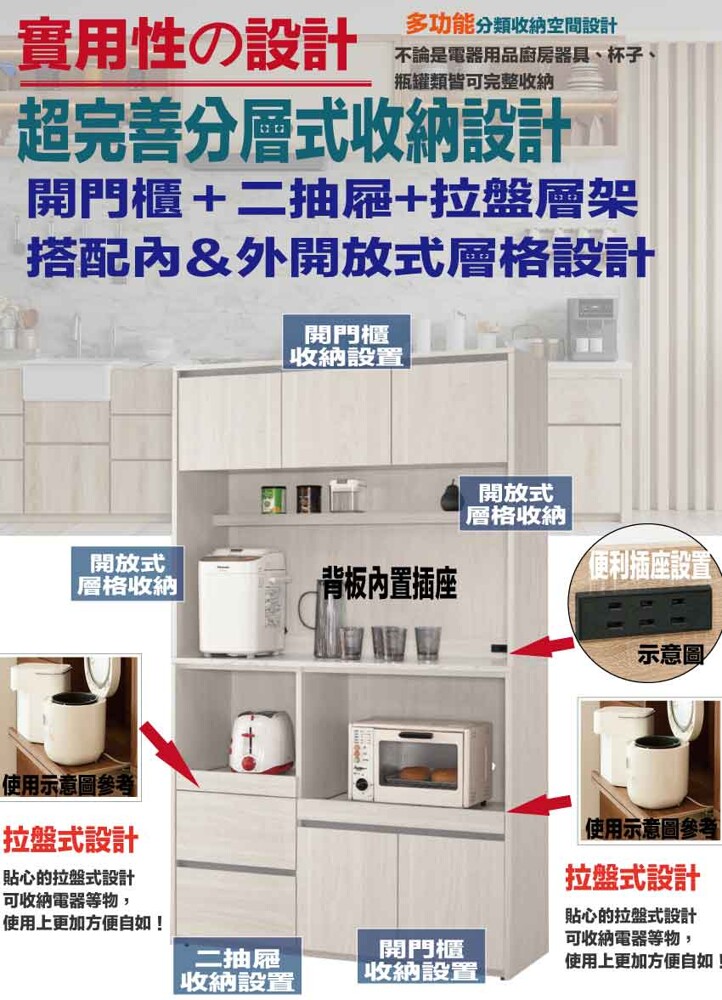 搭配採用開門櫃+拉盤層架+二抽屜+內&外開放層格+便利插座等收納空間設計