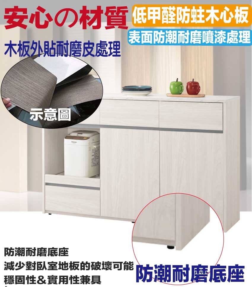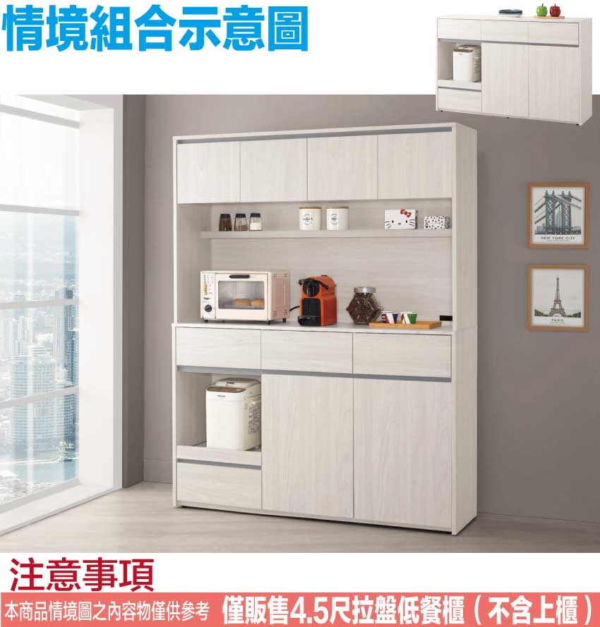 【綠家居】華爾雙色4.5尺二門拉盤低餐櫃 木紋雙色系+安心材質製造,使用放心+搭配居家更便利,採用防蛀木心板+防潮耐磨底座+防夾手緩衝門片五金+仿石紋耐磨美耐皿桌面板+五金滑軌結構等安心材質製造 ,外層採用防潮耐磨噴漆處理搭配採用開門櫃+拉盤層架+三抽屜+內&外開放層格等收納空間設計,全由專人配送到家,專業安心服務,替你省下更多時間!