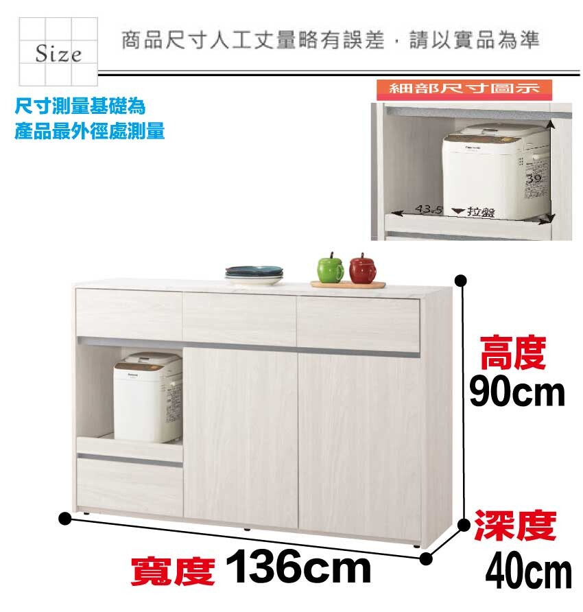 搭配採用開門櫃+拉盤層架+三抽屜+內&外開放層格等收納空間設計