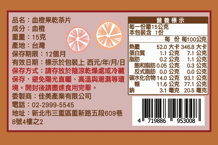 每份:熱量52大卡,蛋白質1.1公克,脂肪0.2公克(飽和脂肪0.05公克,反式脂肪0公克),碳水化合物14.0公克(糖11.6公克),鈉3.1毫克