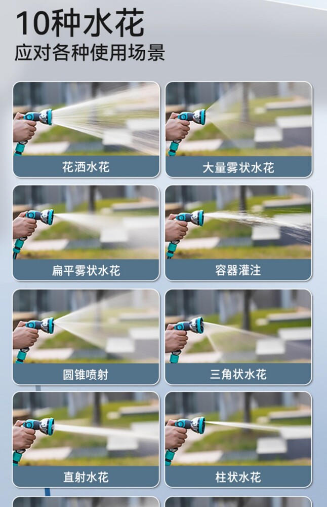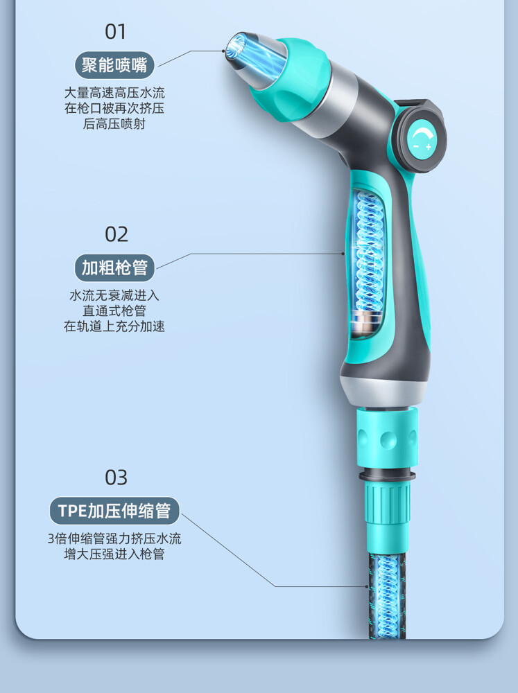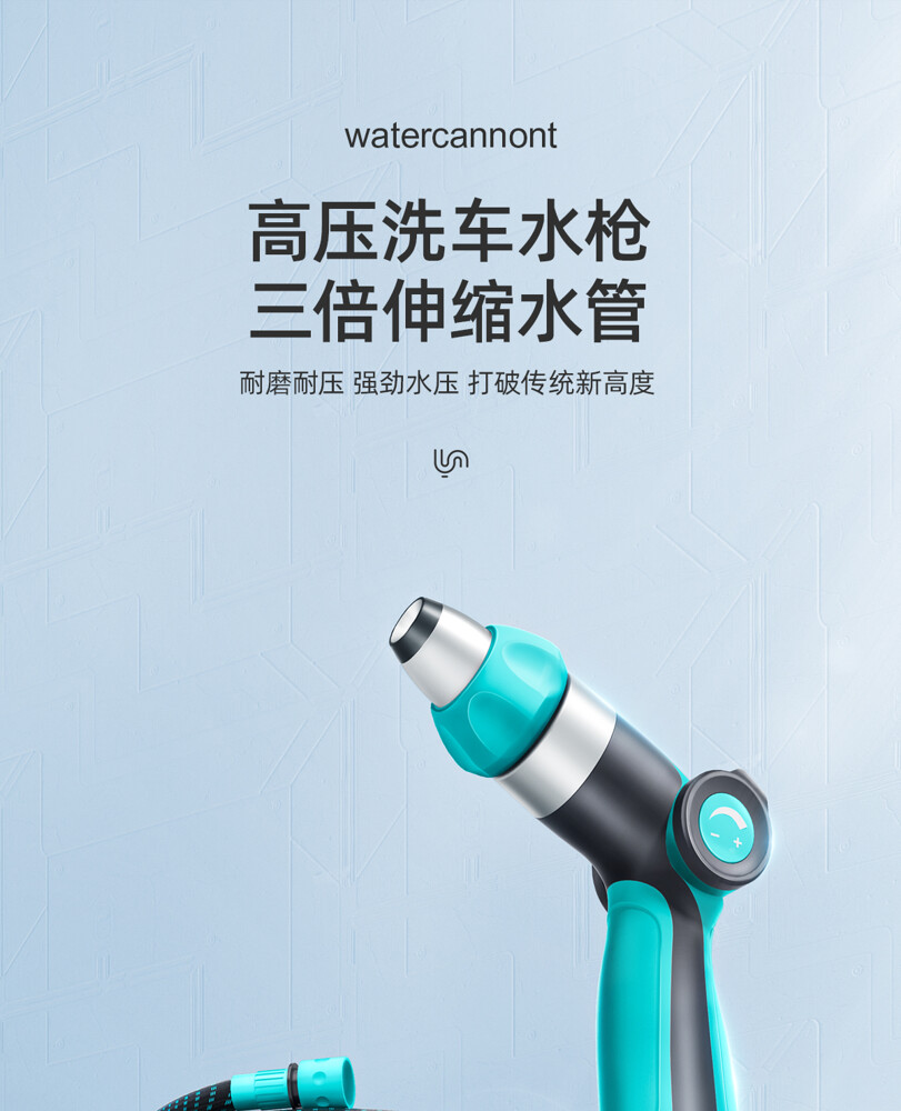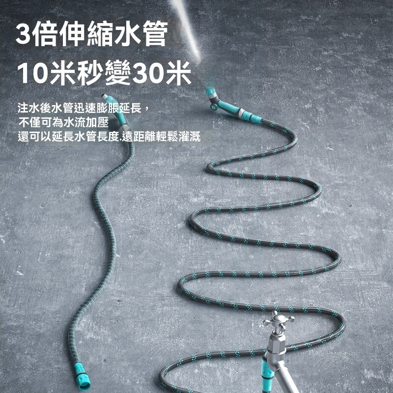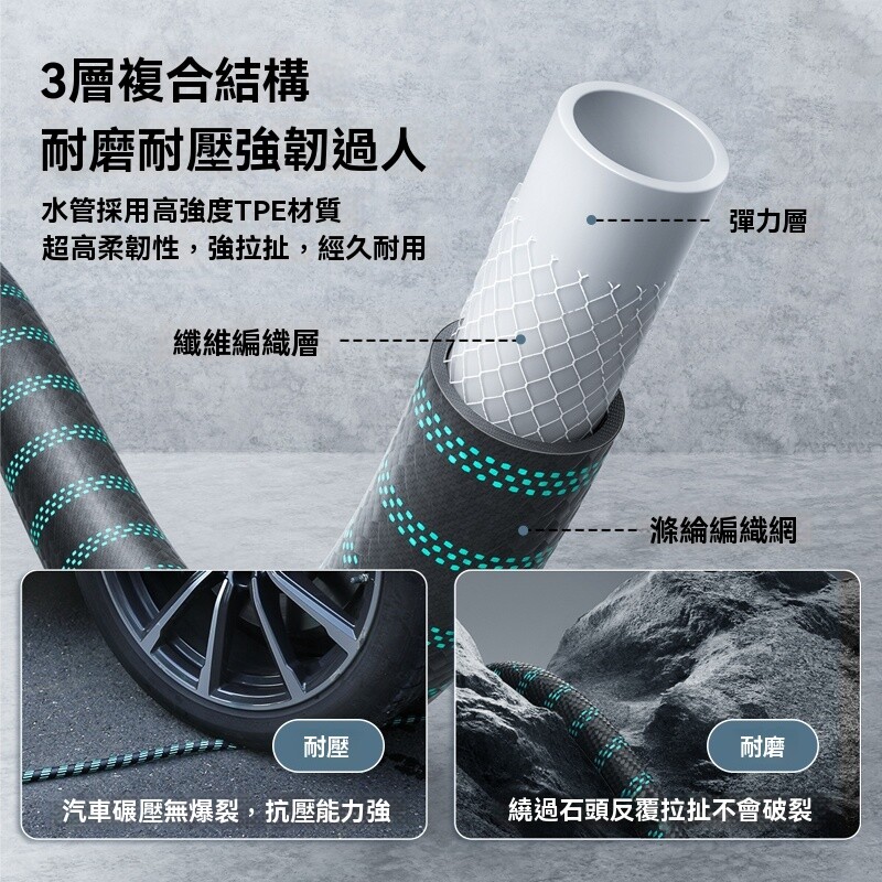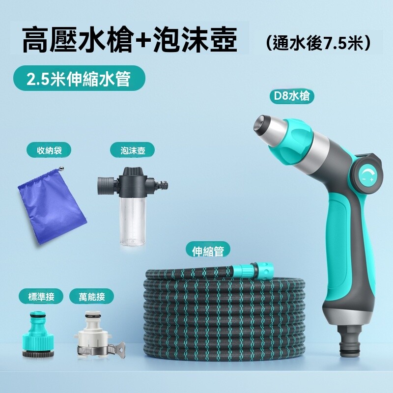 產品品名 高壓洗車水槍伸縮水管 產品材質 塑料、TPE、滌綸 水槍尺寸 (16*11) CM 水槍重量 約220G 水管尺寸:2.5米/5米/7.5/10 (註水後7.5米/15米/22.5米/30米)