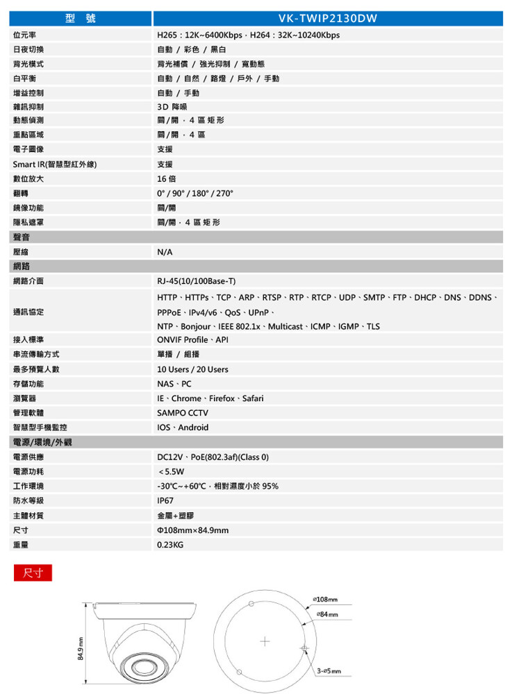 紅外線距離30米,IP67防水等級、PoE