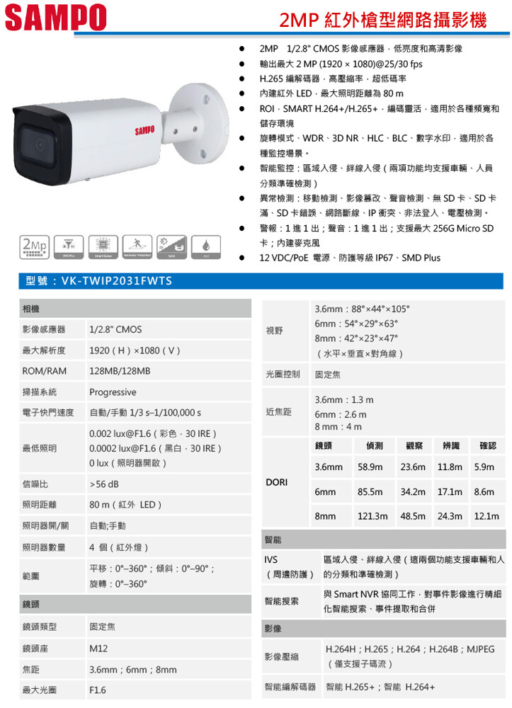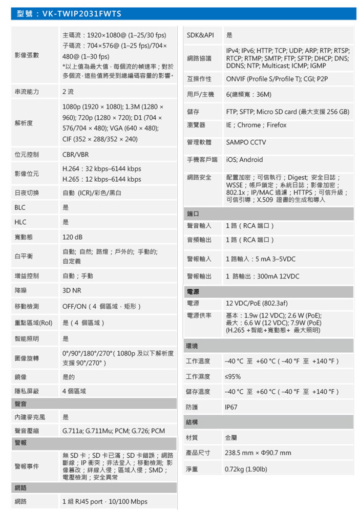 2MP 1/2.8"CMOS影像元件,低照度,高解析度影像