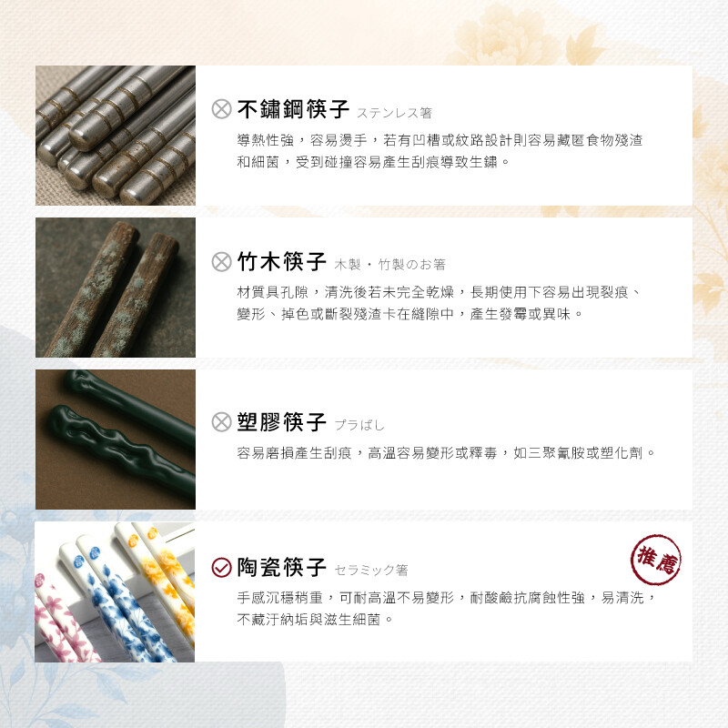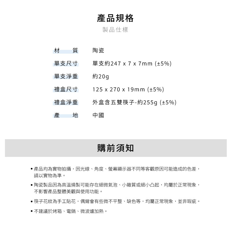 ●筷子花紋為手工貼花,偶爾會有些微不平整、缺色等,屬正常現象,並非瑕疵。