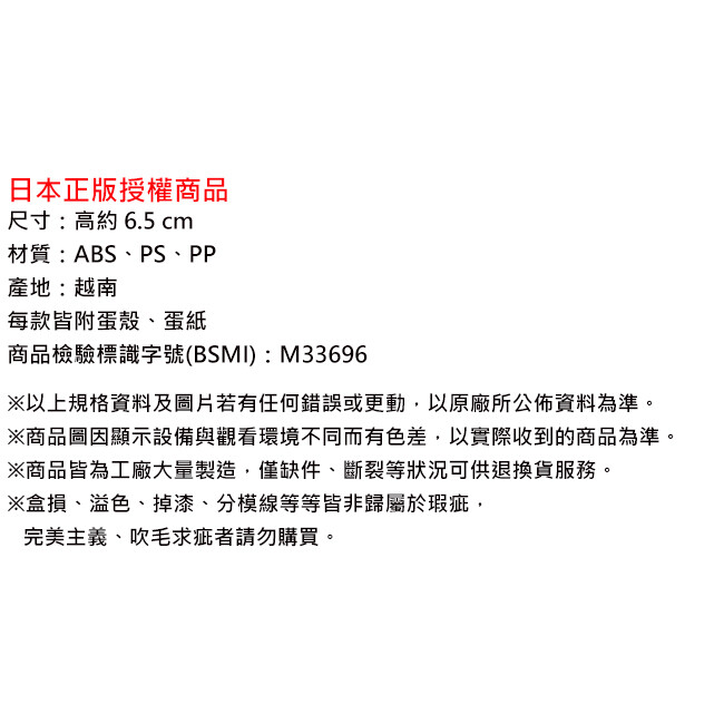 以1/10比例打造 縮小版扭蛋機高約6.5公分 每款皆附6個同色系小扭蛋 及2張迷你貼紙的蛋紙可替換 扭蛋機可互相堆疊、左右擺放 共5款 皆附蛋殼、蛋紙 日本正版授權商品 ※圖片僅供參考,產品以實際收到商品為準。