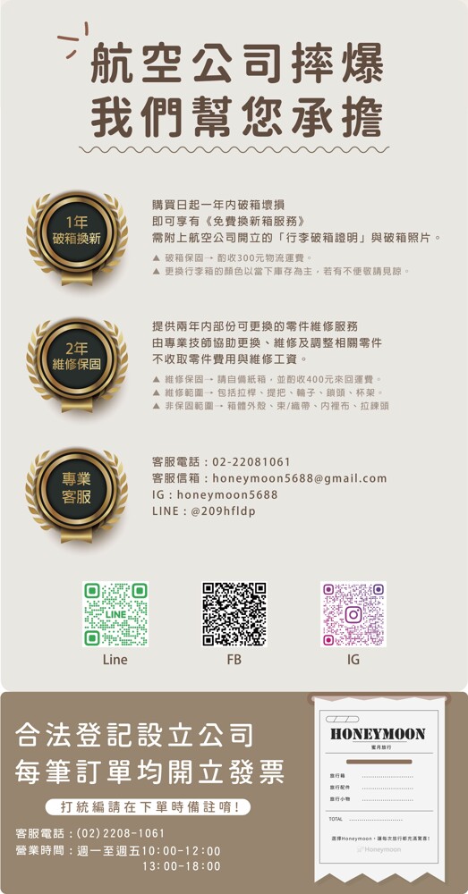 購買日起一年內,被航空公司摔爆,附上航空公司破箱證明+回收破箱,免費換一個新箱(顏色以當下為主)