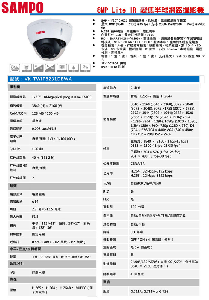 ROI,SMART H.264+/H.265+,靈活編碼 ,適用於各種帶寬和存儲環境旋轉模式、WDR、3D NR、HLC、BLC、數字水印、適用於各種監控場景