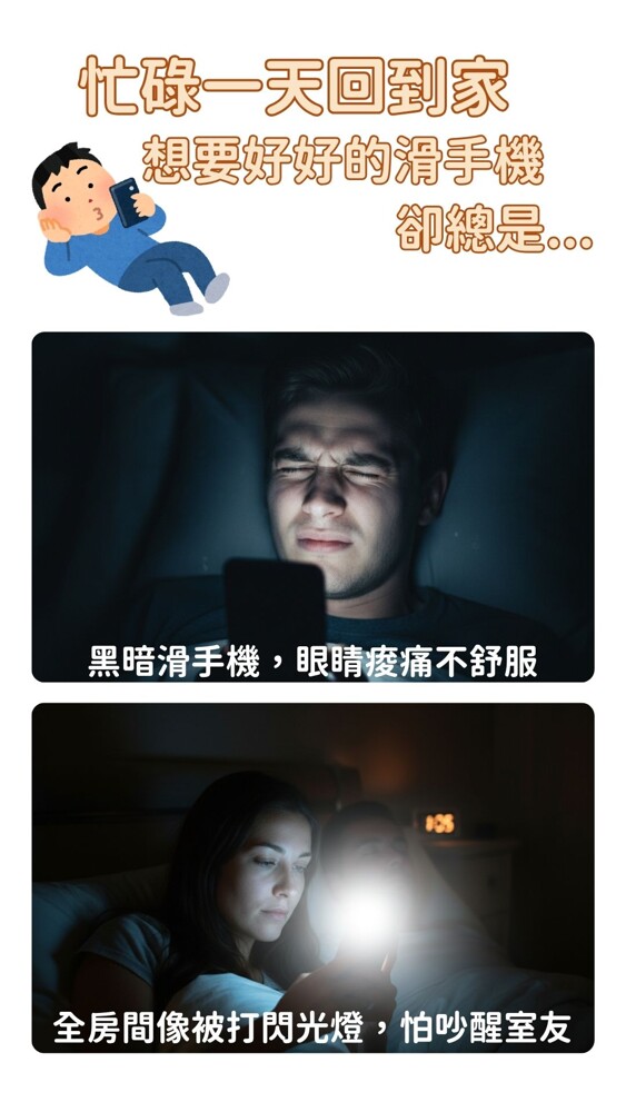 在夜深人靜時,你是否也習慣窩在床上追劇、滑社群、看小說? 夜貓燈,為熬夜滑手機的你量身打造——溫柔照亮螢幕,不刺眼、不打擾,讓你在夜晚依舊擁有舒適視界。